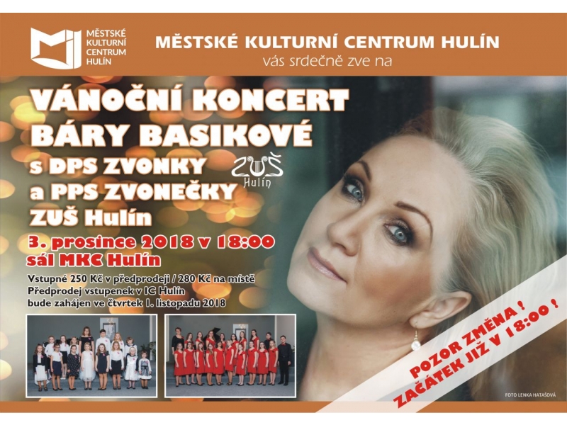 Báru Basikovou znáte jako zpěvačku, která působila v kapele Precedens, zpívá se Stromboli, anebo jako sólistku s bohatou diskografií. Zazářila také v muzikálech Jesus Christ Superstar, Rusalka, Kleopatra nebo Johanka z Arku. V MKC Hulín vystoupí v pondělí 3. prosince od 18:00 hodin spolu s DPS Zvonky a DPS Zvonečky. Vstupné v předprodeji stojí 250 Kč, na místě bude činit 280 Kč.