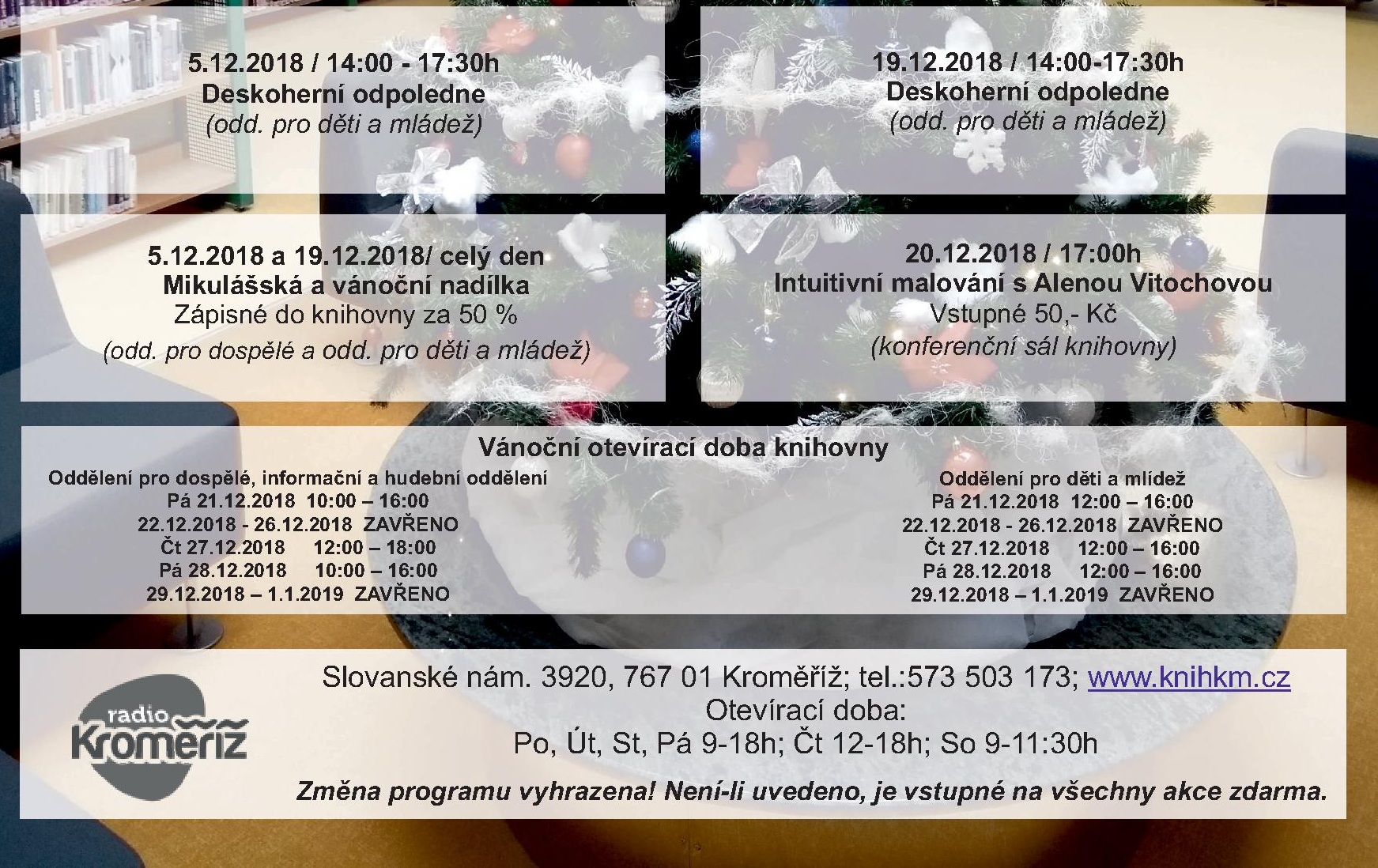 POZOR! Nezapomeňte, že v průběhu vánočních prázdnin má knihovna změněnou otevírací dobu!