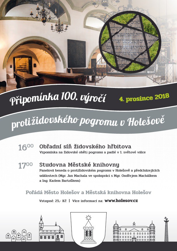 V noci z pondělí 3. prosince na úterý 4. prosince uběhne 100 let od tragické události našich regionálních dějin, a to od protižidovského pogromu v Holešově. Ten si ve městě v úterý připomenou pietní vzpomínkou na oběti pogromu a první světové války a také panelovou diskusí o této události.