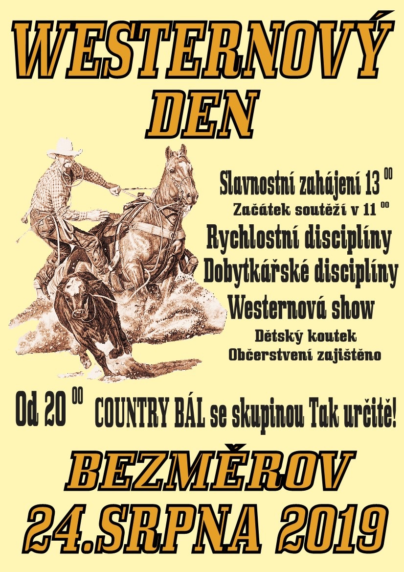 Zůstali jste v srdci kovbojem, nebo jste jen příznivcem westernového ježdění, dobré zábavy či country hudby? Tak neváhejte a zavítejte 24.srpna 2019 do areálu westernového ranče v Bezměrově u Kroměříže, kde se bude konat již osmnáctý ročník westernových závodů v rychlostních disciplínách - jízda kolem barelů, slalom mezi tyčemi, lasování telete, dále pracovní disciplína oddělování telat od stáda a další atraktivní