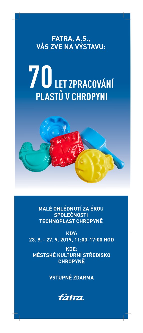 Tento týden od 23. - 27. září 2019 probíhá v Chropyni v městském kulturním středisku výstava k výročí 70. let zpracování plastů. Výstava je pro veřejnost otevřena denně od 11. - 17. hodin.