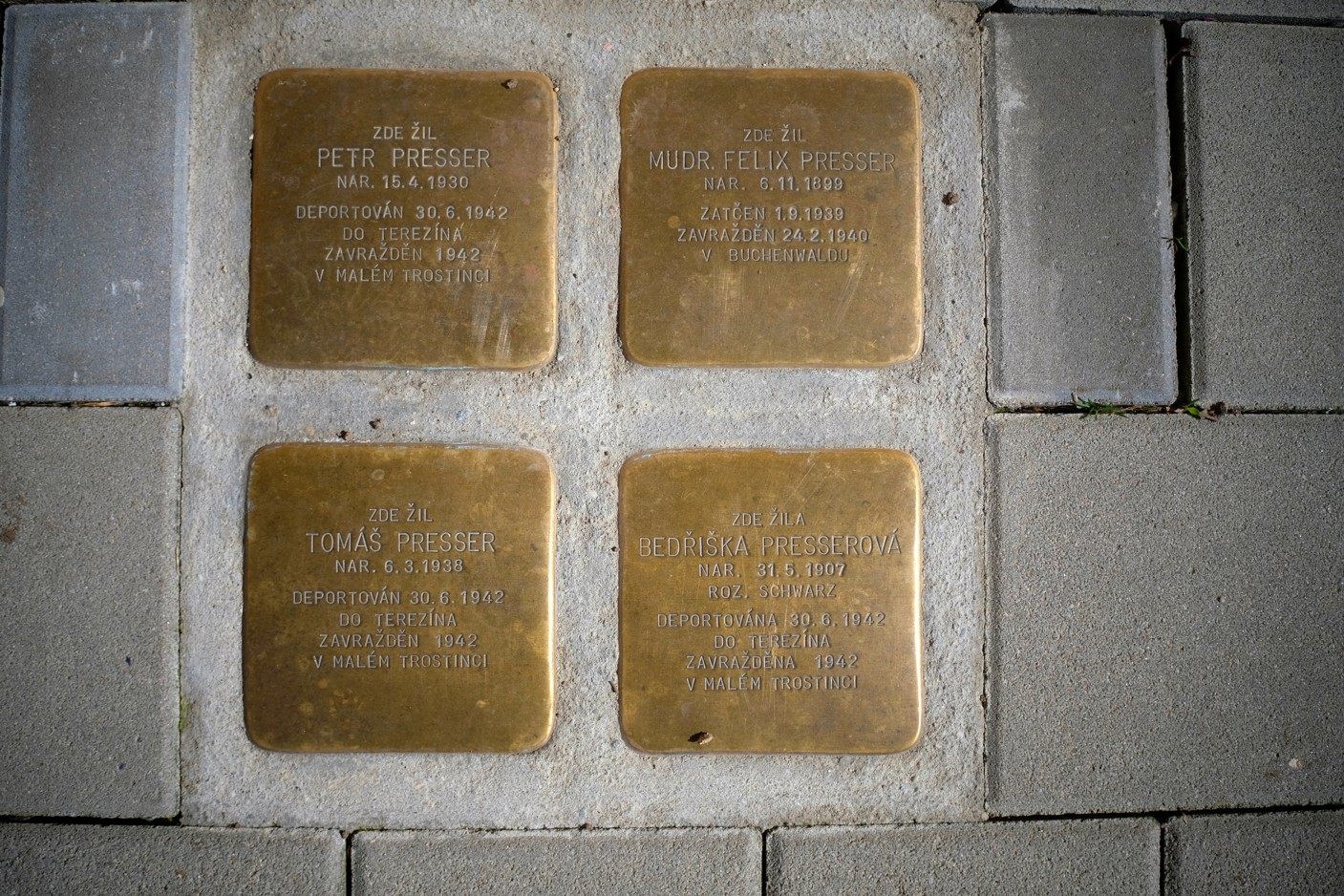 Další kameny jsou v Kollárově ulici a připomínají rodinu lékaře Felixe Pressera. Osud židovské rodiny Presserů se bohužel podobá řadě jiným z doby holokaustu. Lékař Felix Presser zahynul v koncentračním táboře Buchenwald v roce 1940, jeho žena Bedřiška a synové Petr a Tomáš ve vyhlazovacím táboře Malý Trostinec v Bělorusku v roce 1942. Nejmladšímu Tomášovi byly pouhé 4 roky. Neprovinili se ničím, než svým původem.