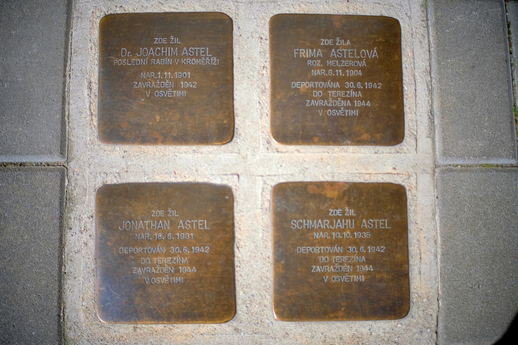 Naši cestu po židovských stopách Kroměříže můžeme začít právě tady. Zvláštní atmosféra, jakou tento kousek města má, vás možná překvapí. Sejděte po několika schůdcích na roh Tylovy ulice a vydejte se dolů kolem bývalých židovských domů až ke staré židovské radnici v Moravcově ulici. Před ní skloňte hlavu a podívejte se na kameny zmizelých, které tu připomínají posledního kroměřížského rabína Joachima Astela a jeho rodinu, kteří zahynuli v Osvětimi.