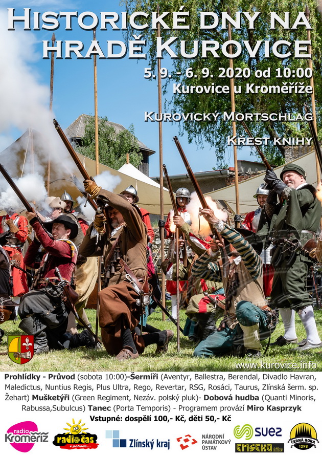 Na hradě Kurovice, nedaleko Holešova, uskuteční další ročník Historických dnů. V rámci těchto historických slavností, máte jedinečnou možnost, dozvědět se na prohlídkách s průvodcem historii tohoto zajímavého objektu. Na parkánu se budou po oba dny střídat se svými vystoupeními šermířské skupiny, historické tance a dobová hudba. V sobotu je už tradičně připravena soutěž šermířských choreografií Kurovický Mortschalg a také podvečerní cyklus odborných přednášek v útrobách samotného hradu. Dále uvidíte mušketýry, historické bitky a můžete ochutnat i speciality z historické kuchyně. V neděli, po téměř čtyřech stoletích navštíví Kurovice opět vévoda Albrecht z Valdštejna, se svým doprovodem. Níže uvádíme program slavností - pracovní.