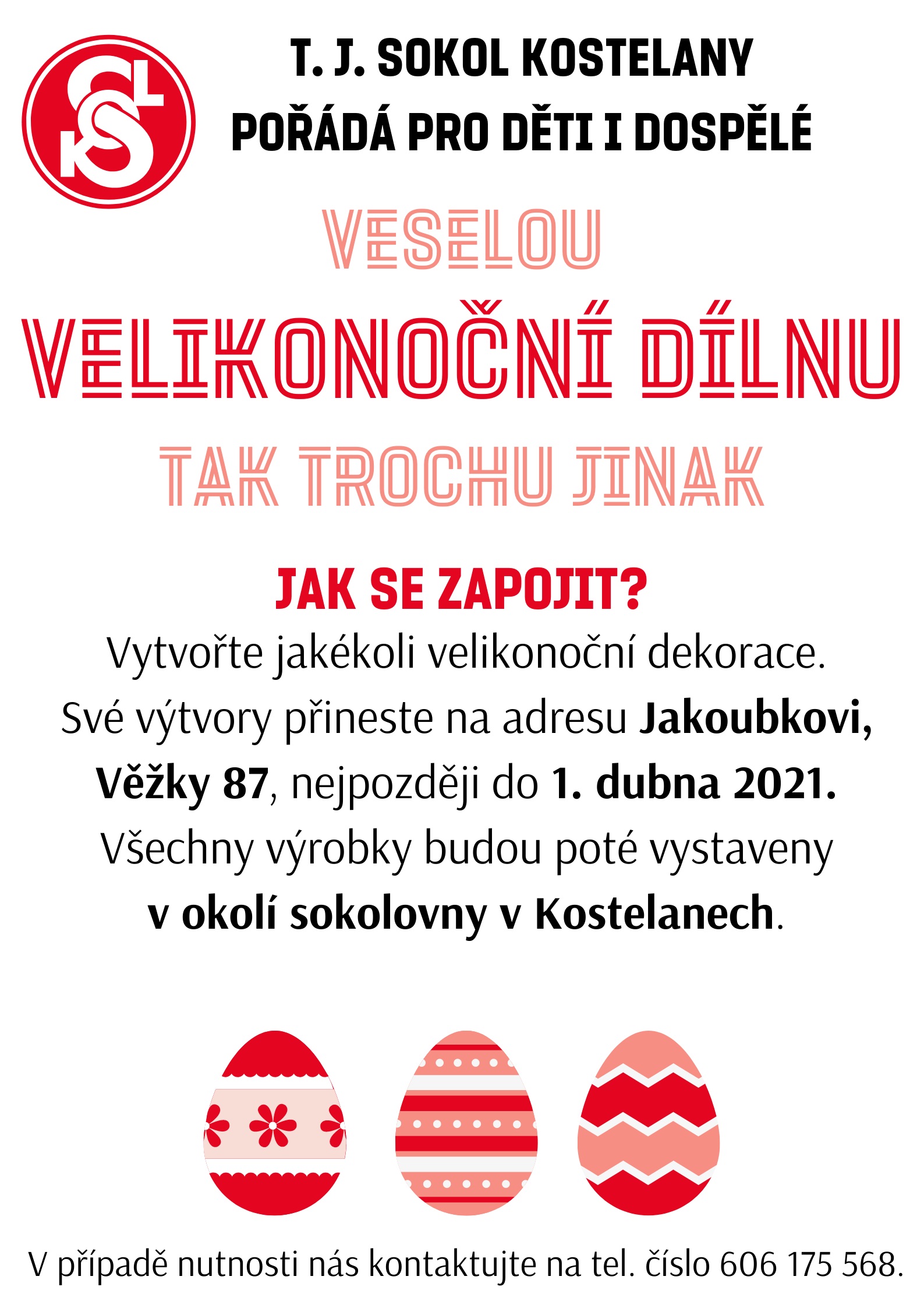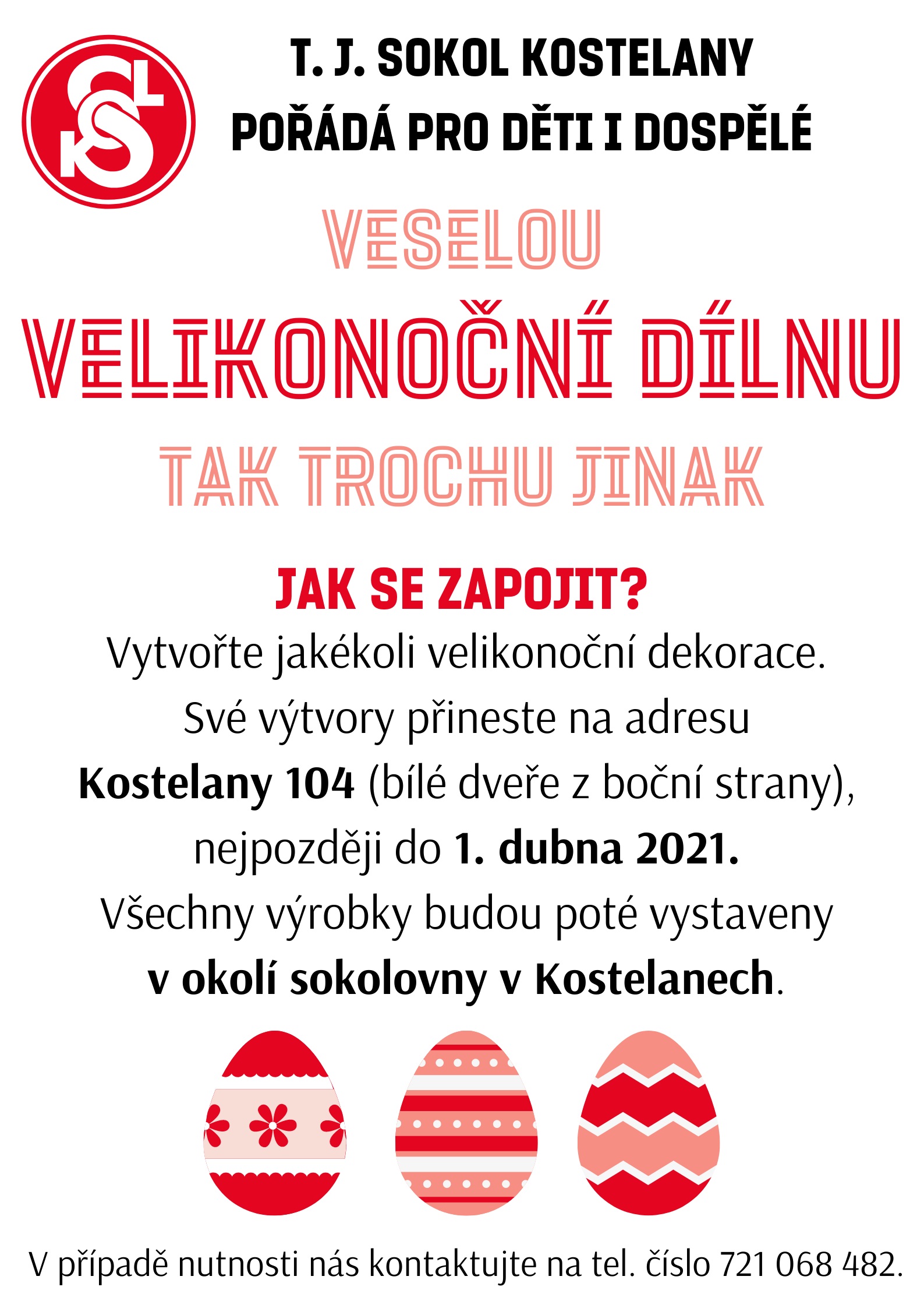 Touto dobou bychom za normální situace pořádali Velikonoční dílnu na sále naší sokolovny, to nám teď ale bohužel není umožněno. Proto bychom rádi dílnu alespoň částečně vynahradili a zároveň si zpříjemnili tuto dobu tím, že společnými silami vytvoříme velikonoční výstavku v okolí naší sokolovny v Kostelanech.
