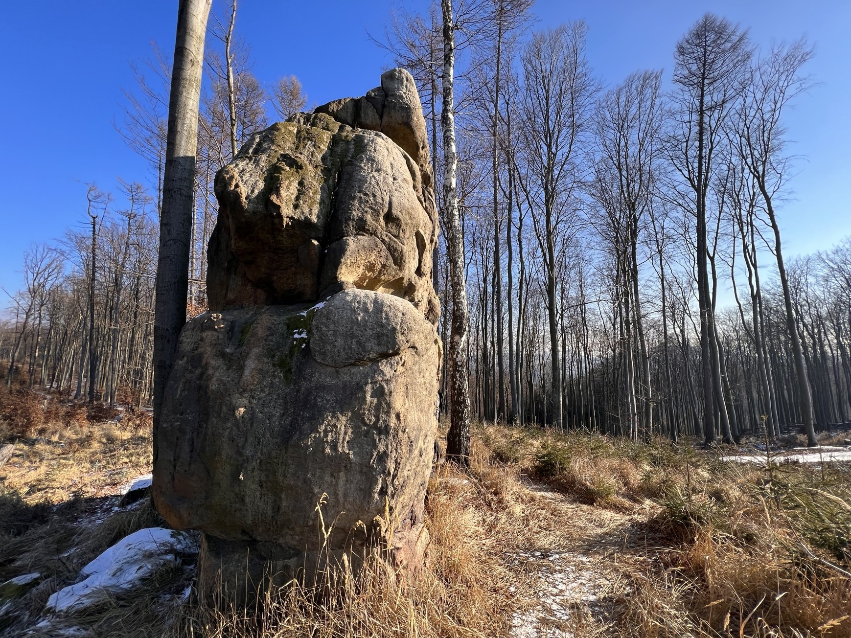 Třeba u Čertových kamenů. K tomuto místu se vážou prastaré pověsti a legendy. Údajně když do většího balvanu dáte hlavu a přiložíte ucho ke skále, uslyšíte, jak čerti vaří v kotli vodu. Komárec je pak o pár set metrů a převýšení dál. Při stoupání minete také osamocený sedm metrů vysoký skalní útvar.