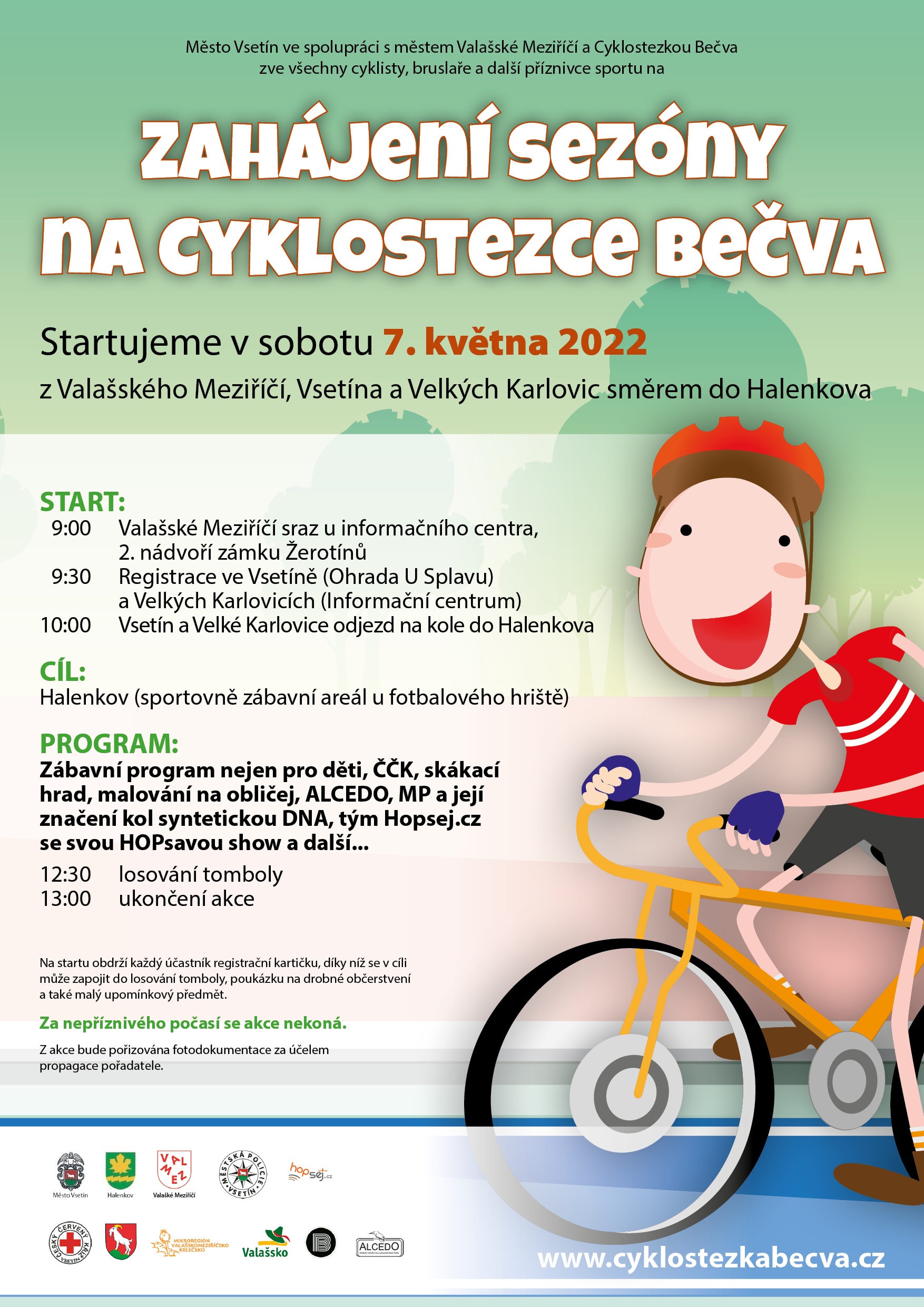 Nenechte si ujít v sobotu 7. května oblíbené zahájení sezony na Cyklostezce Bečva. Připojit se můžete z Valašského Meziříčí, kde bude sraz v 9 hodin u informačního centra, dále pak ze Vsetína od Splavu na Ohradě, kde bude od 9.30 hodin probíhat registrace nebo také od infocentra ve Velkých Karlovicích. Společný start bude pak v 10 hodin ze Vsetína a z Velkých Karlovic a cílem bude tradičně sportovně zábavní areál na Halenkově. Každý registrovaný účastník se může v cíli zapojit do tomboly, obdrží poukázky na menší občerstvení, které využije v cíli na Halenkově, kde bude pro všechny připraven zábavný doprovodný program nejen pro děti s ALCEDEM, Českým červeným křížem, Městskou policií, která bude značit kola syntetickou DNA, ale těšit se můžete i na oblíbené malování na obličej nebo na hopsavou show.