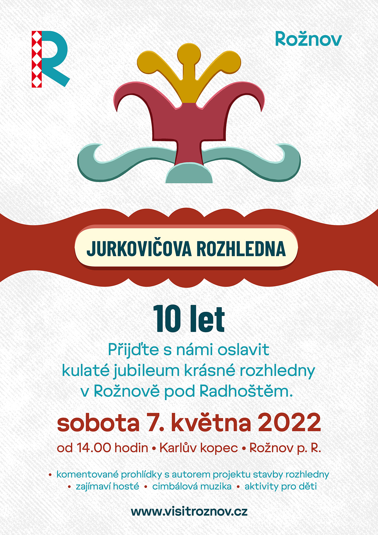 Přijďte si užít v sobotu 7. května od 14 hodin oslavu 10. výročí od otevření Jurkovičovy rozhledny v Rožnově pod Radhoštěm. Těšit se můžeme na komentované prohlídky s autorem projektu stavby rozhledny, cimbálovou muziku nebo aktivity pro děti. Rozhledna je viditelná i z Masarykova náměstí, a právě odtud se k ní dostanete za pouhých 45 minut pěší chůze.