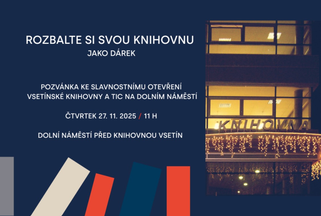 Nenechte si ujít slavnostní otevření nově zrekonstruované Masarykovy veřejné knihovny a Turistického informačního centra Vsetín. Akce s mottem „Rozbal si svou knihovnu jako dárek“ proběhne ve čtvrtek 27. listopadu od 11 hodin na Dolním náměstí před knihovnou a poté v jejích prostorách. Čeká vás bohatý program až do 18 hodin – každý si bude moci „rozbalit“ novou knihovnu, objevit její moderní prostory, služby a odnést si malý dárek. Těšte se na vědomostní kvízy, výrobu záložek, scénické čtení, tvoření pro rodiče s dětmi, nahlédnutí do kronik, maraton čtení, exkurze s knihovníkem, vánoční stromeček přání či hudební doprovod Valašských hudců.