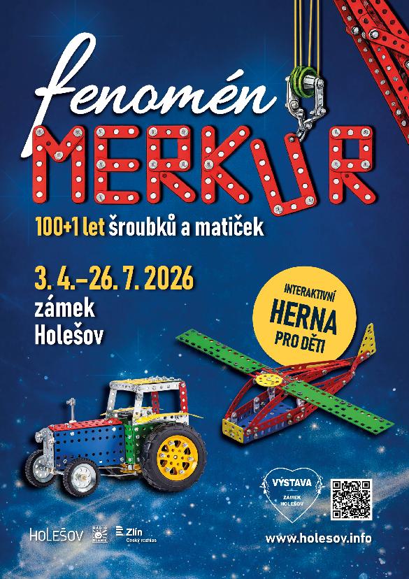 Statisíce šroubků a matiček, stovky modelů a dvě tuny výstavního materiálu na 350 metrech čtve-rečních. Plus herna k tomu. Zámek Holešov otevře 3. dubna 2026 největší výstavu letošní sezony s názvem Fenomén MERKUR 100+1 let šroubků a matiček. Výstava vznikla ve spolupráce se sbě-ratelem Martinem Stupňánkem.