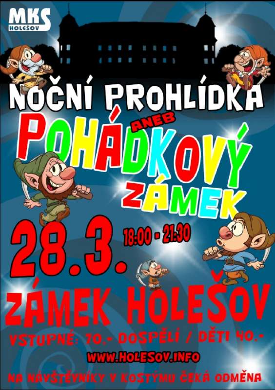 "Návštěvníky čeká soutěžní pohádkové putování rozsáhlými prostorami zámeckých sklepů, New Drive Clubu, přízemních arkád, Sala terreny a prvního patra. Čeká na ně například Maková panenka, Bob a Bobek, Pat a Mat, Jeníček s Mařenkou a Ježibabou, Mach a Šebestová a další klasické pohádkové postavy. Návštěvníci v kostýmu budou odměněni," sdělila Radiu Kroměříž Dana Podhajská z MKS Holešov.