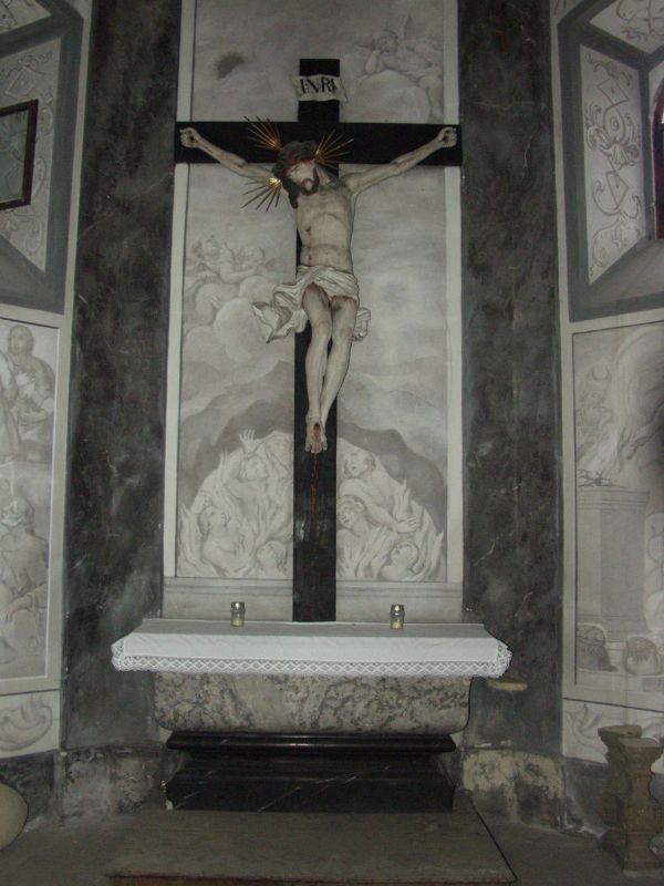 V čele kaple je prostý oltář a nad ním velký dřevěný kříž s ukřižovaným Ježíšem, odtud pochází i název kaple. Malba nad oltářem zachycuje hříšníky v očistci. Na stěnách osmiboké kaple jsou namalovány působivé výjevy ze Starého a Nového zákona vztahující se k poslednímu soudu. Malby pocházejí z doby okolo roku 1750.