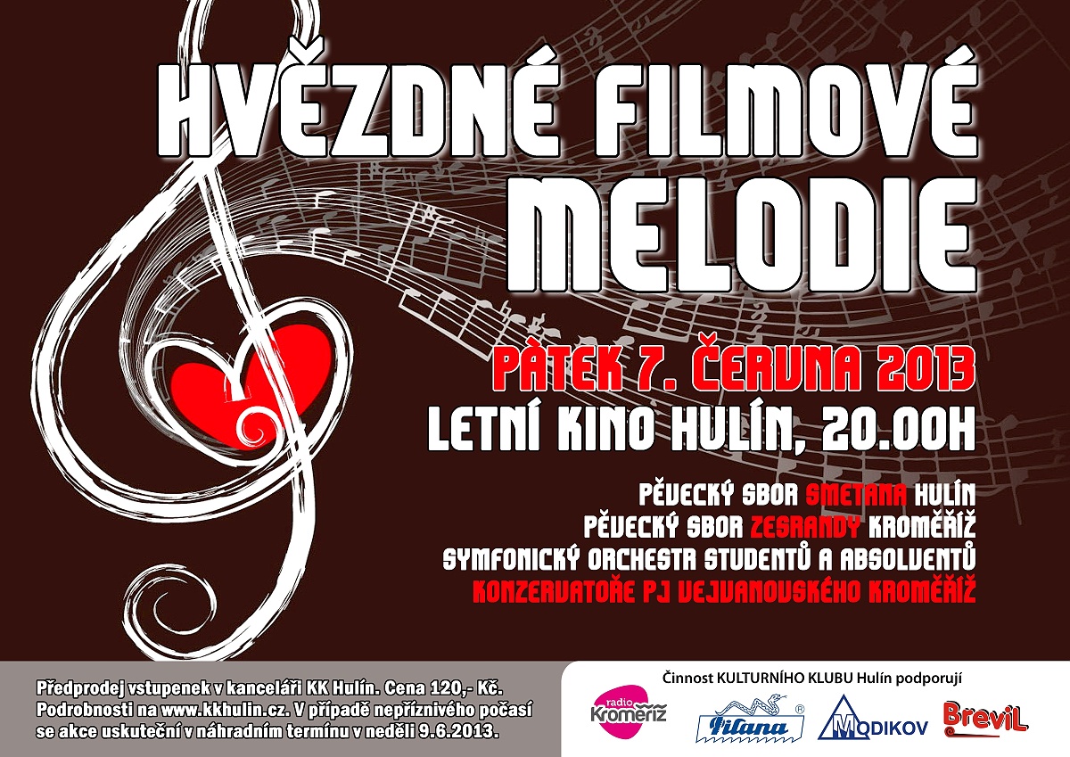 V pátek 7. června se v letním kině v Hulíně uskuteční koncert Hvězdné filmové melodie. Plakát s informacemi naleznete v příloze.