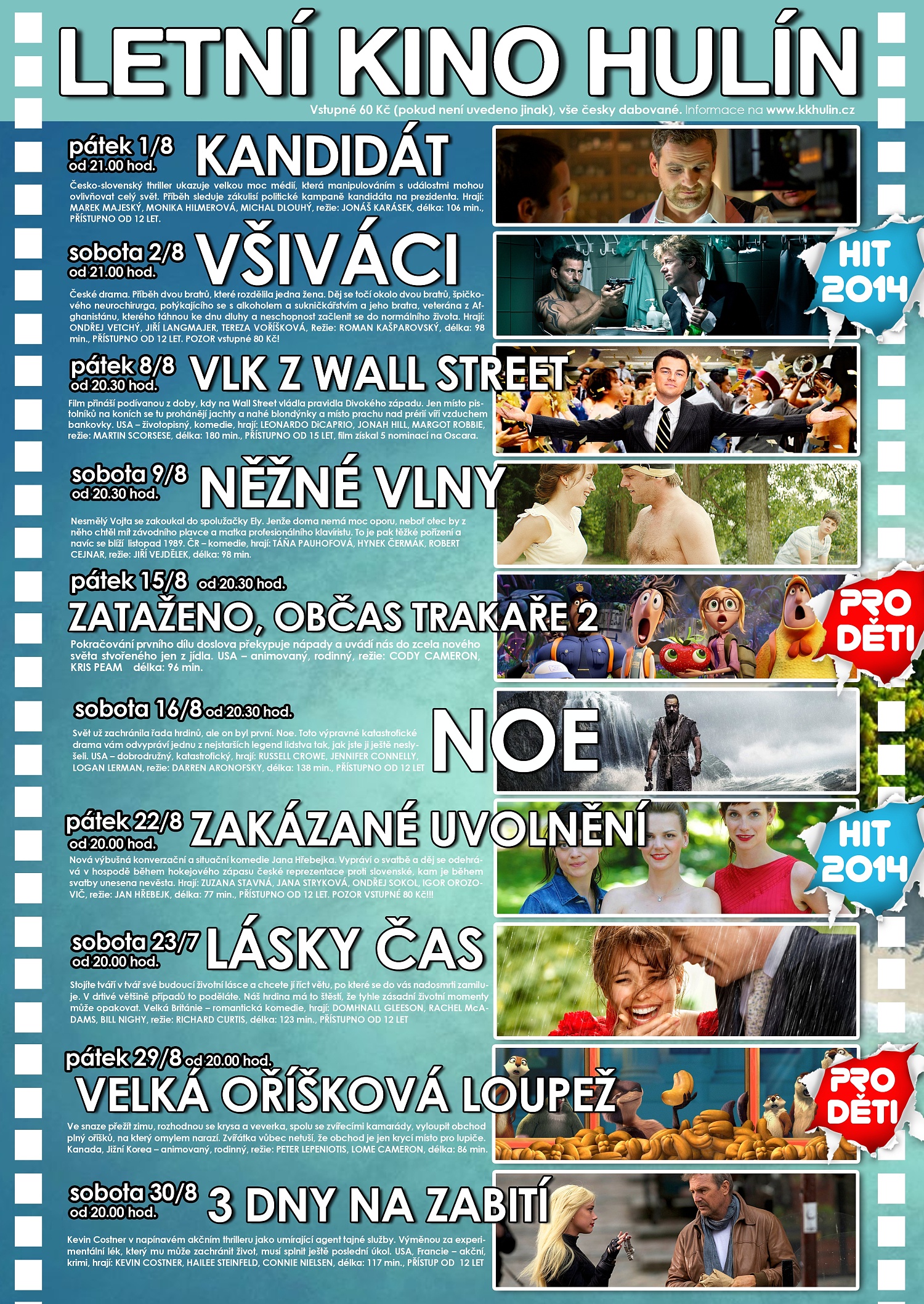 V srpnu se v Hulíně můžete těšit na filmy Vlk z Wall Street, Noe, Zakázané uvolnění nebo animované snímky Zataženo, občas trakaře 2 a Velká oříšková loupež a další snímky.