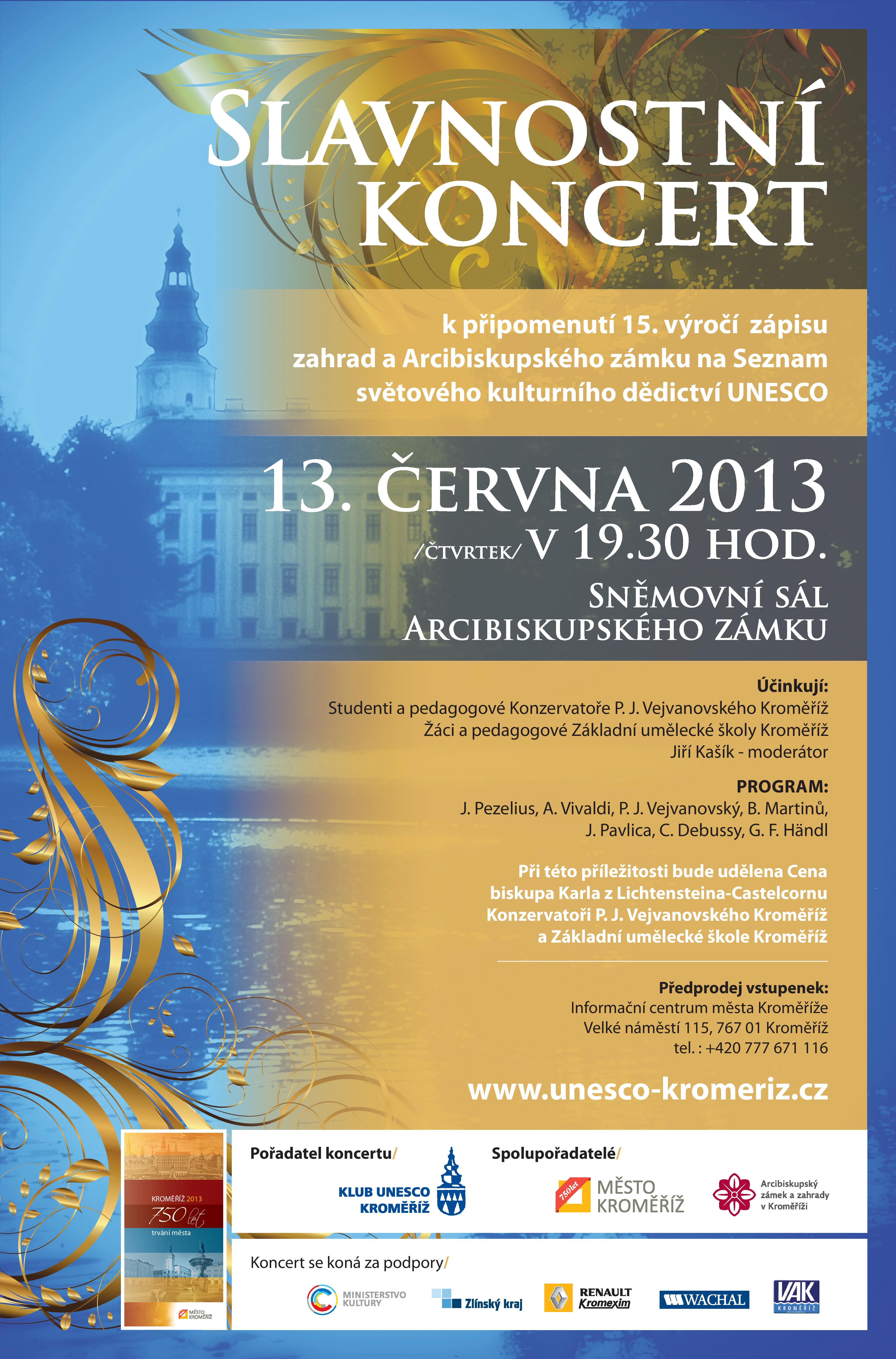 Ve čtvrtek 13. 6. 2013 v 19.30 se ve Sněmovním sále Arcibiskupského zámku uskuteční slavnostní koncert, který hudbou i slovem připomeneme 15. výročí zápisu zahrad a Arcibiskupského zámku a na Seznam UNESCO.