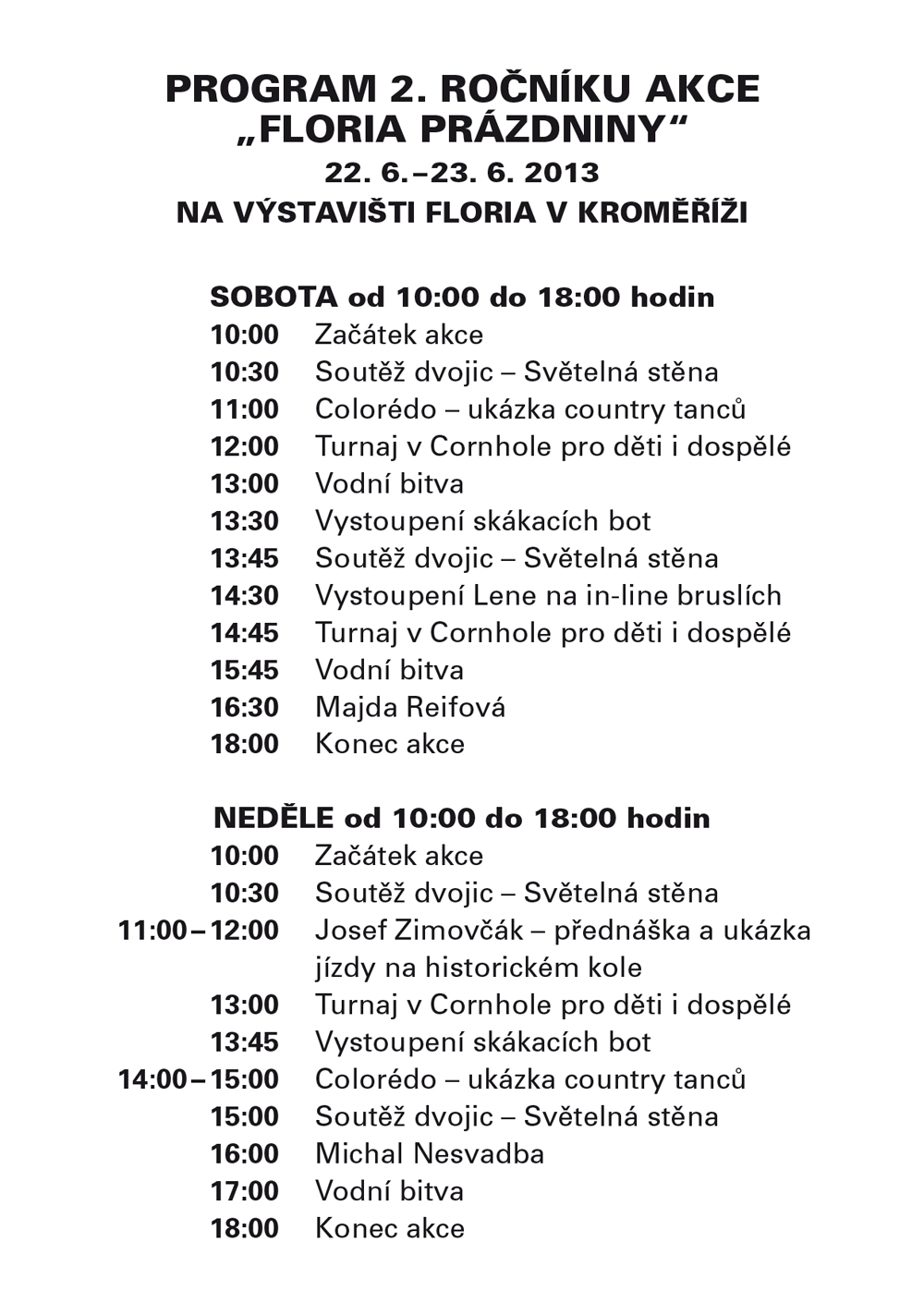 V sobotu 22. června přivítá návštěvníky Výstaviště Floria Majda Reifová a v neděli 23. června Michal Nesvadba. Akce zaujme i větší děti a dospělé, když přednášku a ukázku jízdy na historickém kole předvede Josef Zimovčák, který na tomto kole zdolal slavnou Tour de France.