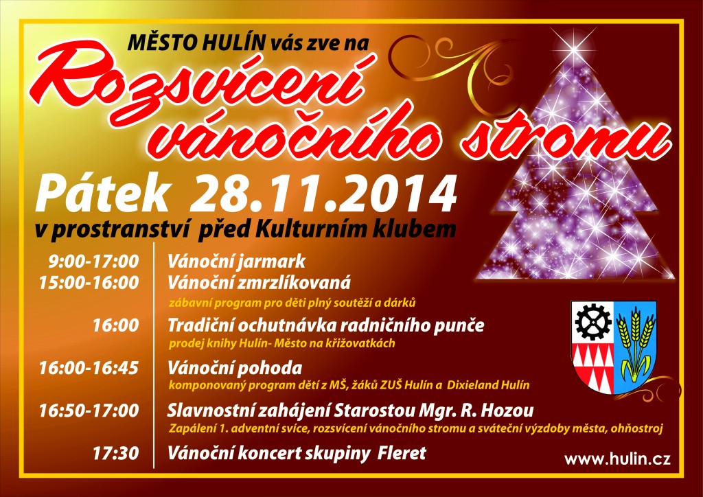 V Hulíně se v pátek 28. listopadu bude slavnostně rozsvěcet vánoční strom. Před Kulturním klubem bude od rána vánoční jarmark, připraven je odpolední program pro děti a po rozsvícení vánočního stromu zahraje vizovická skupina Fleret.