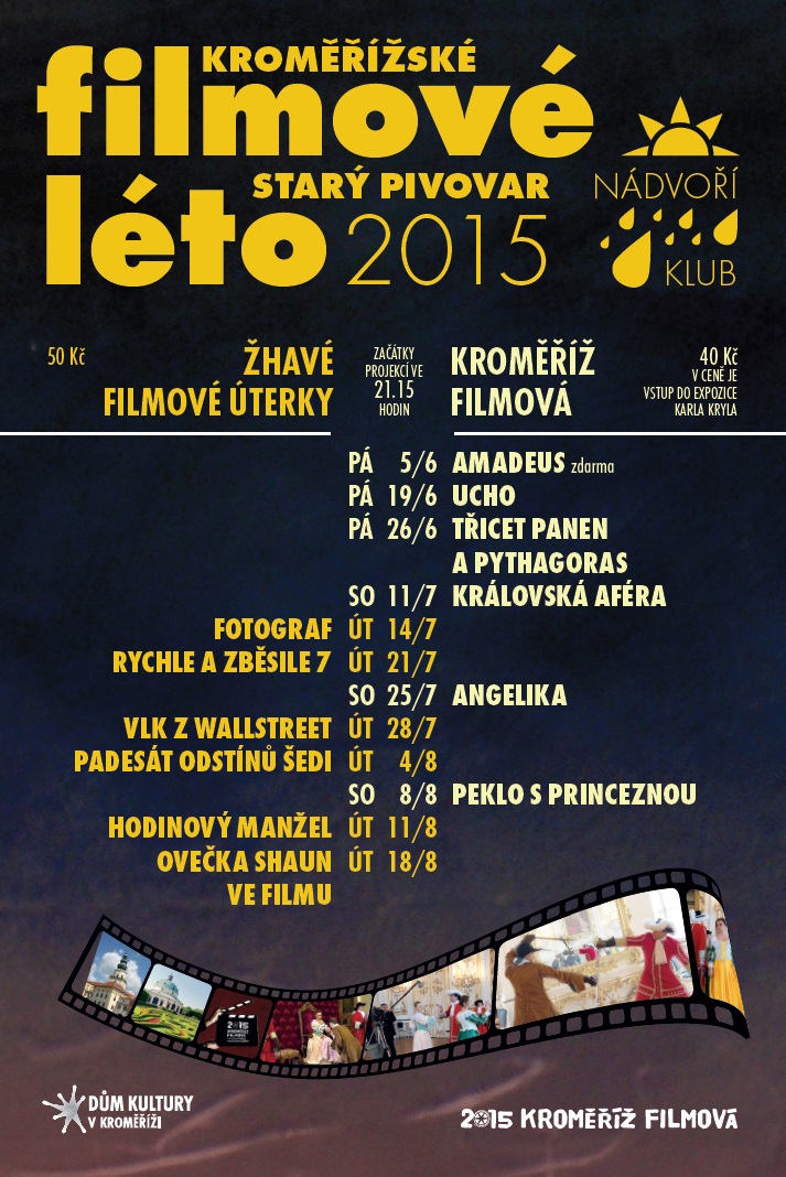 Sezóna oblíbených letních filmových projekcí pod širým nebem - Kroměřížské filmové léto 2015 pokračuje. Projekce budou probíhat na nádvoří radnice, ve dvoře Starého pivovaru, vždy ve 21:15 hodin.