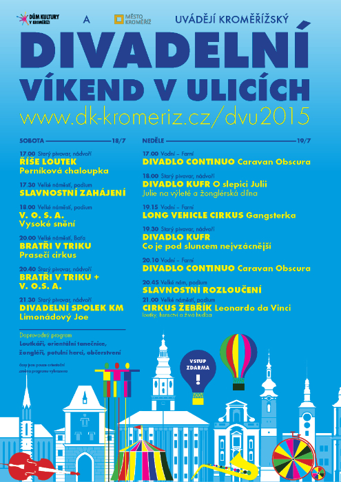 Divadelní víkend nabídne od 18. do 19. července letní prázdninové atraktivní setkání s nejlepšími soubory pouličních divadel, pouliční hudby, artistů, ale i praktických aktivit pro děti a dospělé (dílny, workshopy…).
