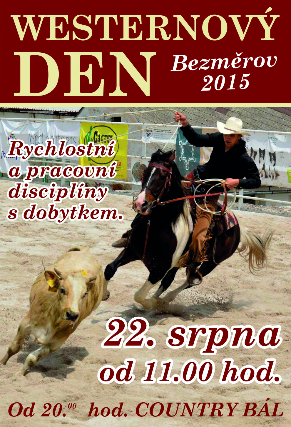 Tak jste to právě vy, koho zveme tuto sobotu 22. srpna do areálu westernového ranče v Bezměrově, kde se uskuteční již 14. ročník westernových závodů. K vidění budou jak rychlostní disciplíny, jako jízda kolem barelů, slalom mezi tyčemi, tak i pracovní disciplíny kovbojů s dobytkem, chytání telat do lasa a zahánění vybraných kusů do připravené ohrady.