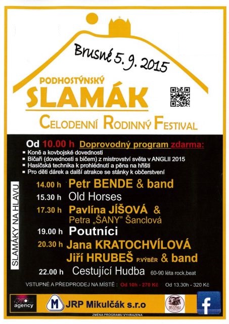 V sobotu 5. září od 10 hodin se v obci Brusné uskuteční celodenní rodinný festival PODHOSTÝNSKÝ SLAMÁK. Od 10 hodin je připraven doprovodný program. Těšit se můžete na koně a kovbojské dovednosti, bičaře (dovednosti s bičem) z mistrovství světa v Anglii 2015, hasičskou techniku, pěnu na hřišti, pro děti budou připraveny dárečky.