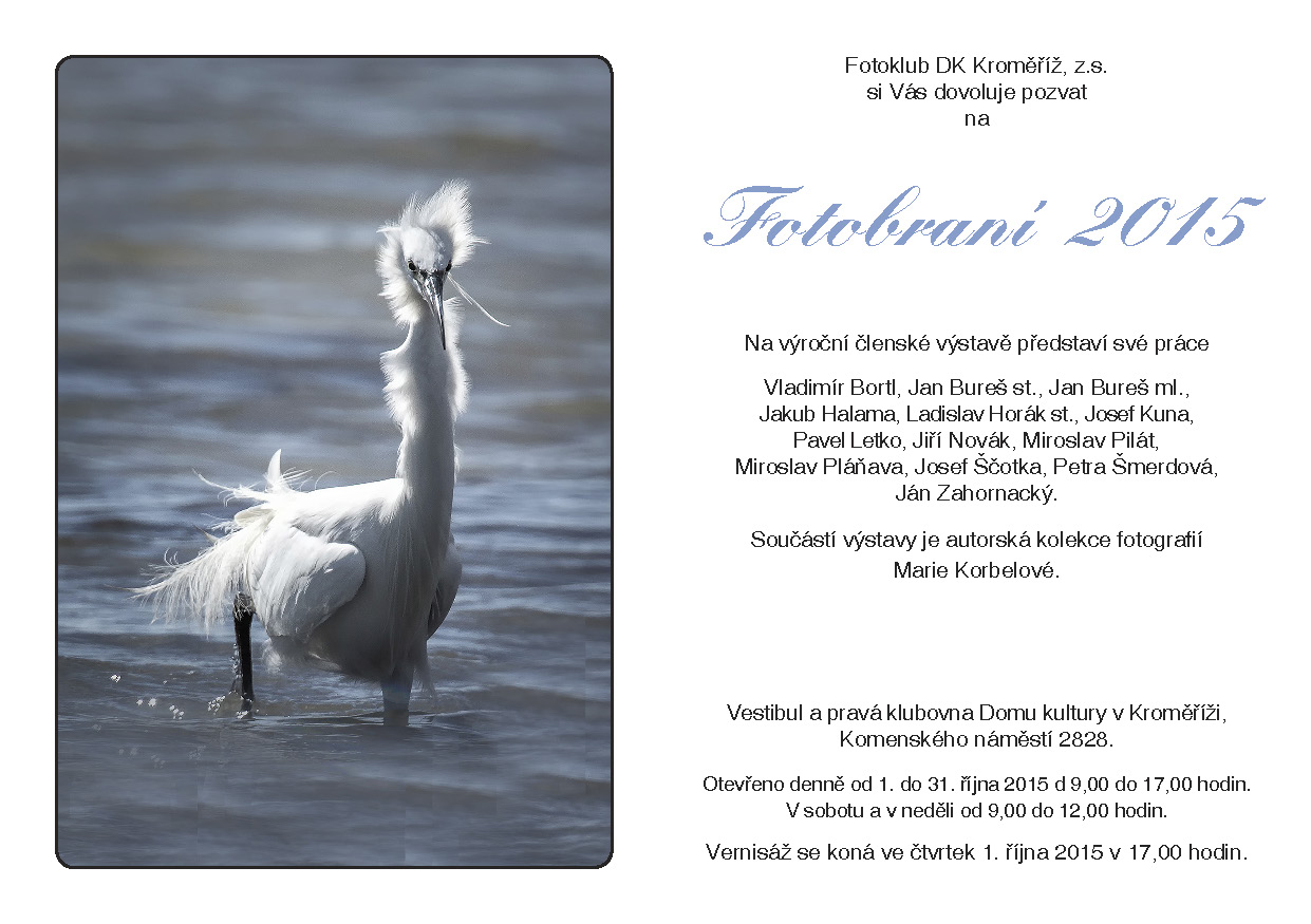 Na tradiční výroční členské výstavě kroměřížského fotoklubu představí své práce Vladimír Bortl, Jan Bureš st., Jan Bureš ml., Jakub Halama, Ladislav Horák st., Josef Kuna, Pavel Letko, Jiří Novák, Miroslav Pilát, Miroslav Pláňava, Josef Ščotka, Petra Šmerdová nebo Ján Zahornacký.