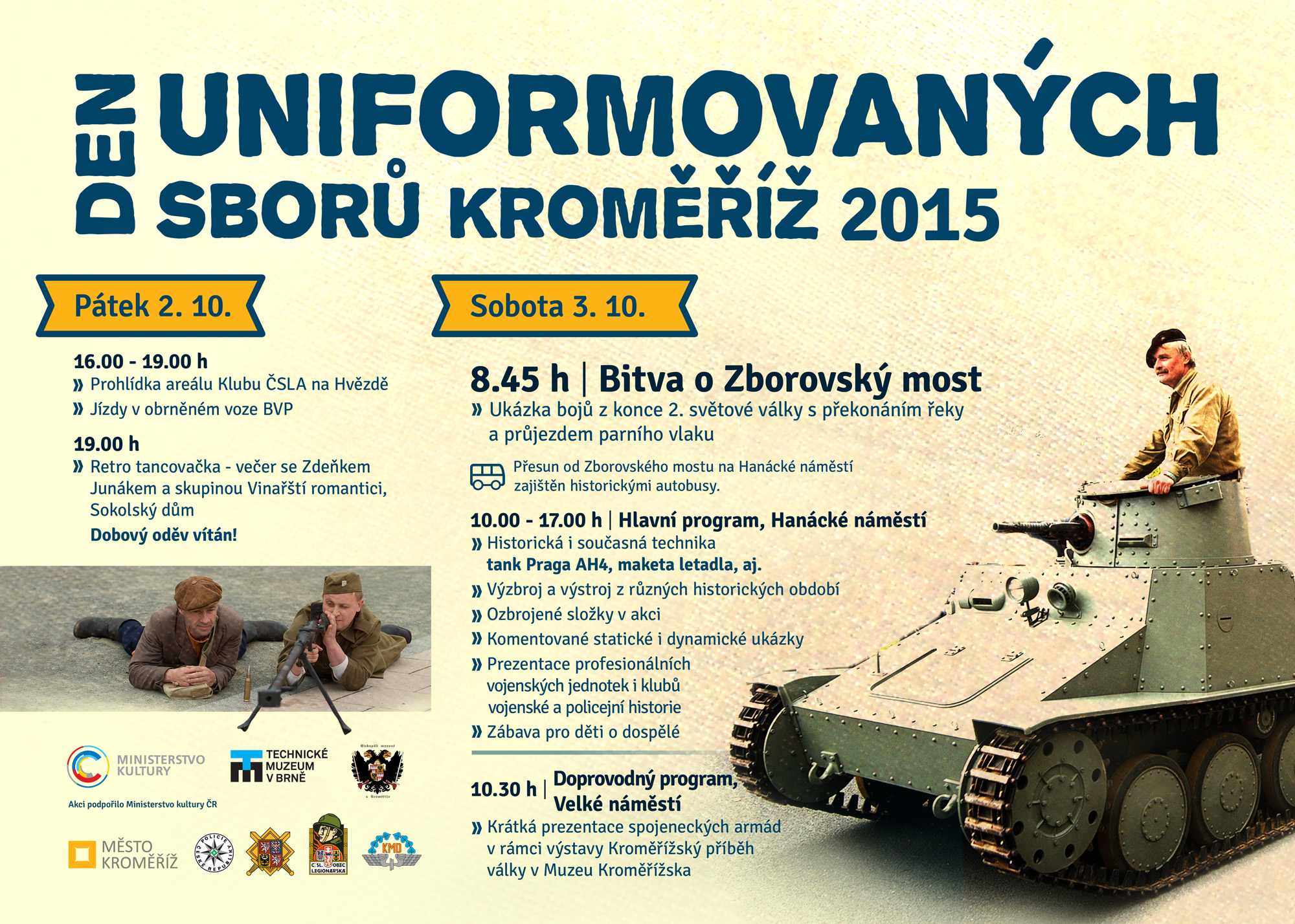 Vojenskou tradici sahající až do dob Marie Terezie si v sobotu 3. října připomene Kroměříž. Z mnoha koutů republiky se do města sjedou milovníci vojenské, policejní i hasičské historie a současnosti, aby společně oslavili Den uniformovaných sborů. Přehlídka techniky, výzbroje a výstroje s akčními ukázkami zakončí úspěšnou turistickou sezonu a při příležitosti letošního 70. výročí osvobození města nabídne hned několik atraktivních překvapení.