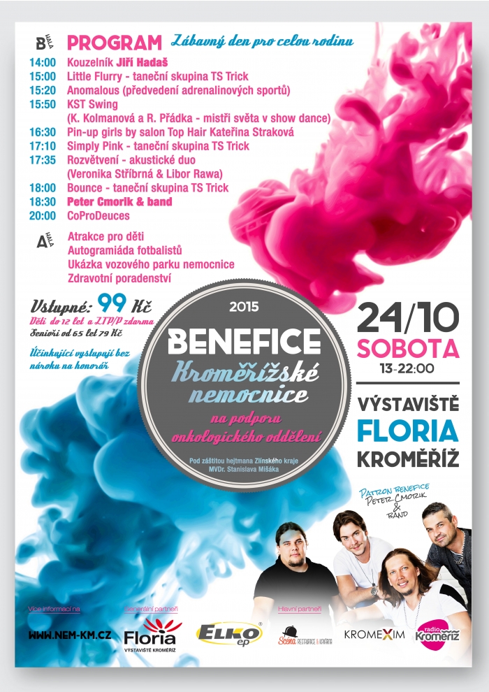 Pomoci dobré věci a užít si dobrou zábavu po celý den. Přesně tyto možnosti mají všichni, kteří v sobotu 24. října zavítají na Výstaviště Floria v Kroměříži. Tamní prostory totiž po roce ožijí v pořadí druhou Beneficí Kroměřížské nemocnice, jejíž výtěžek poputuje tentokrát na onkologické oddělení.