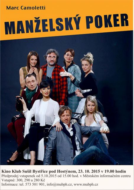 Město Bystřice pod Hostýnem pořádá divadelní představení plné hereckých hvězd nazvané MANŽELSKÝ POKER, které se uskuteční v pátek 23. října v 19 hodin v Kino Klub Sušil.