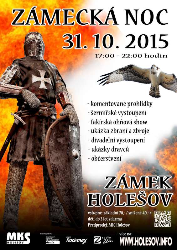Tradiční zakončení zámecké sezóny v Holešově se tentokrát odehraje v dobovém stylu. Nepřetržitý program nabídne v sobotu 31. října od 17 do 22 hodin rytířská vystoupení a ohňovou show historické skupiny Memento Mori na zámeckém nádvoří včetně ukázek zbraní a zbroje, v sálech zámku se můžete těšit na ukázky dravců, divadelní vystoupení a chybět nebudou ani komentované prohlídky s průvodci každou půlhodinu.