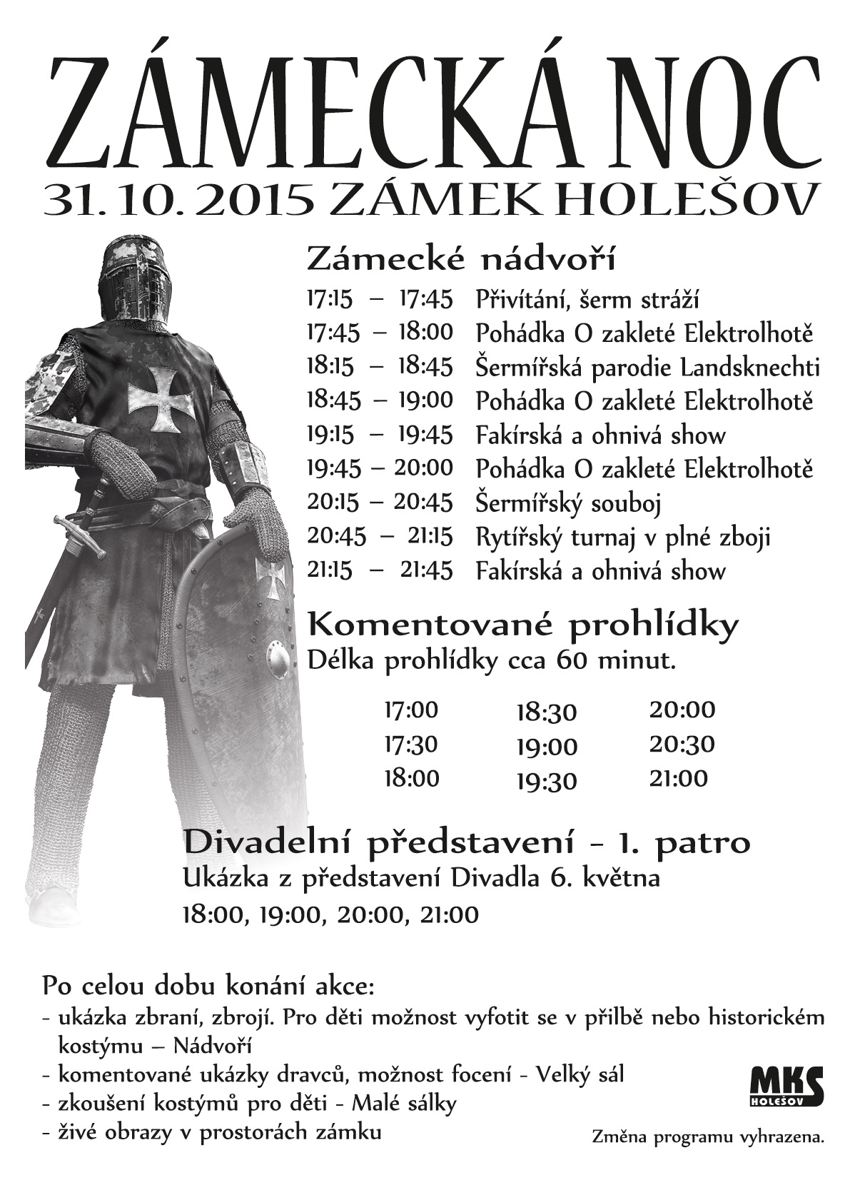 - Uvedený program bude probíhat nepřetržitě po celý večer od 17:00 do 22:00 hod. Na nádvoří zámku můžete sledovat rytířská vystoupení a ohňovou show, děti si mohou prohlédnout dobové zbraně, vyfotit se v rytířské přilbě či historickém kostýmu, v sálech zámku budou probíhat ukázky dravců či divadelní vystoupení.