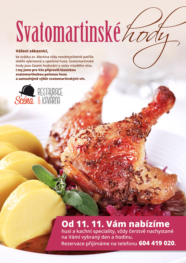 Svatomartinské menu nebo ochutnávku vín pro Vás v období kolem 11. listopadu připravily také některé restaurace, hotely a penziony v Kroměříži a okolí, mezi nimiž tradičně nechybí ani Restaurace a kavárna Scéna Kroměříž (více v obrazové příloze).