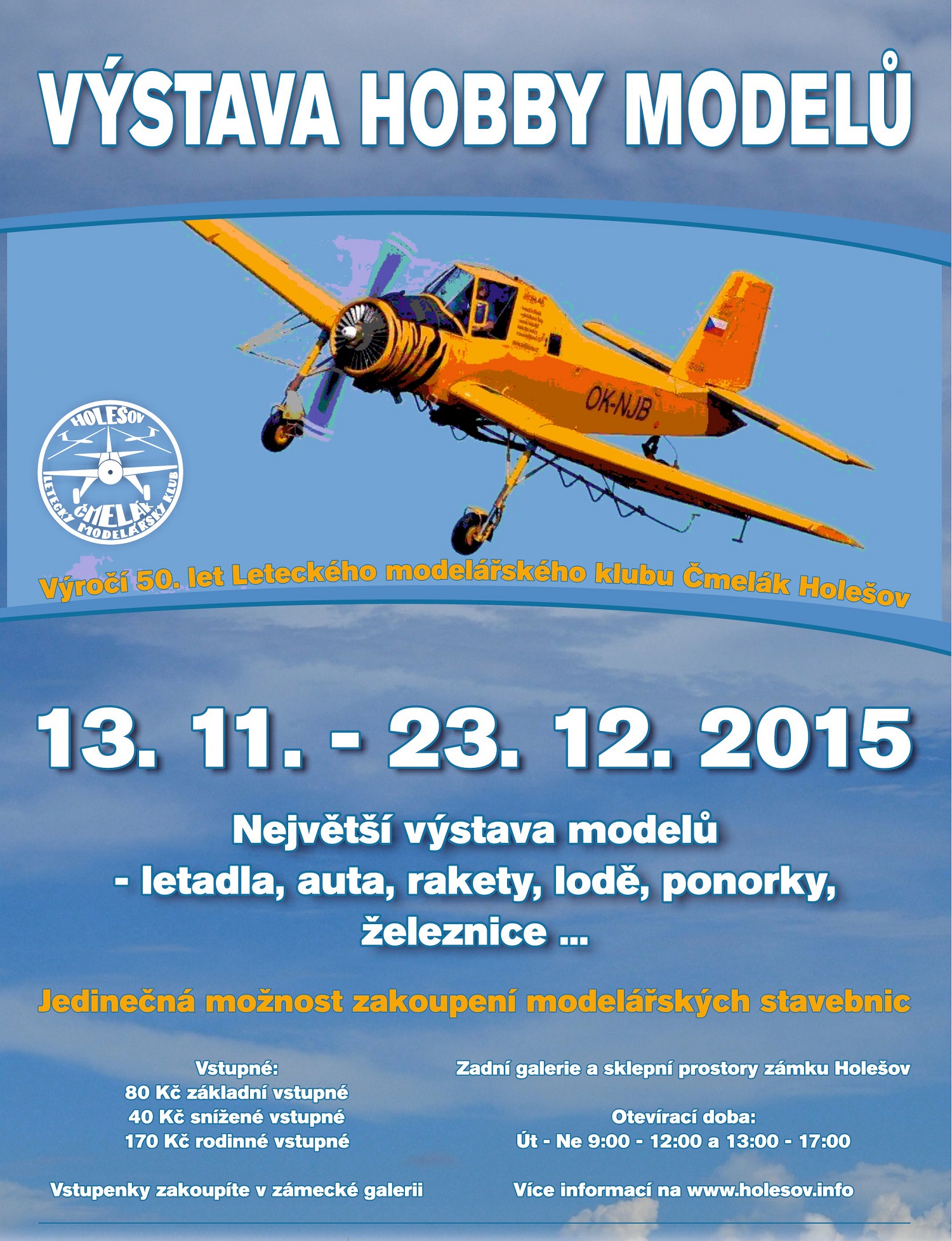 Zámek Holešov v pátek 13. listopadu otevřel největší výstavu hobby modelů v České republice. Modely lodí, letadel, aut, raket a vláčků, mezi kterými se najdou opravdové rarity. Například motor do modelu letadla o obsahu 800 ccm nebo zmenšenina Pragy W3S vyrobená v roce 1964 ze dřeva jen s pomocí nože a lupenkové pilky.