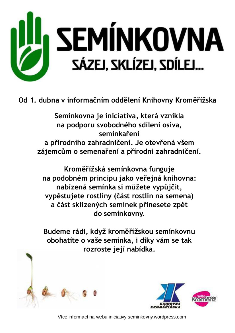 Novinou je, že se knihovna připojila k projektu Semínkovna, tzn. že si kromě knížek,novin, časopisů, audioknih, map, brýlí, deštníků, deskových her, CD, DVD můžete vyzvednout i různá semínka k sadbě. Naopak můžete přinést vaše semínka. Krátkodobě má Semínkovna k dispozici i cibulky vnitřních rostlin: šťavel trojlistý a čtyřlistý a zmijovec.