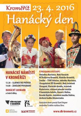Město Kroměříž ve spolupráci s Domem kultury pořádá 23. dubna na Hanáckém náměstí HANÁCKÝ DEN - zábavné odpoledne směřující k podpoře hanáckého folklóru ve městě i jeho okolí formou prezentací souborů, krojů, zvyků a obyčejů, tvůrčích dílen i regionální gastronomie.