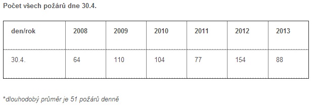 V loňském roce, během celého dne 30. 4. 2013, vyjížděli hasiči k 88 požárům, což je více, než dlouhodobý denní průměr (51 požárů). Od 17. hodiny do půlnoci hasiči likvidovali 43 požárů. Od půlnoci do 7. hodiny ranní dne 1. května pak 10 požárů.