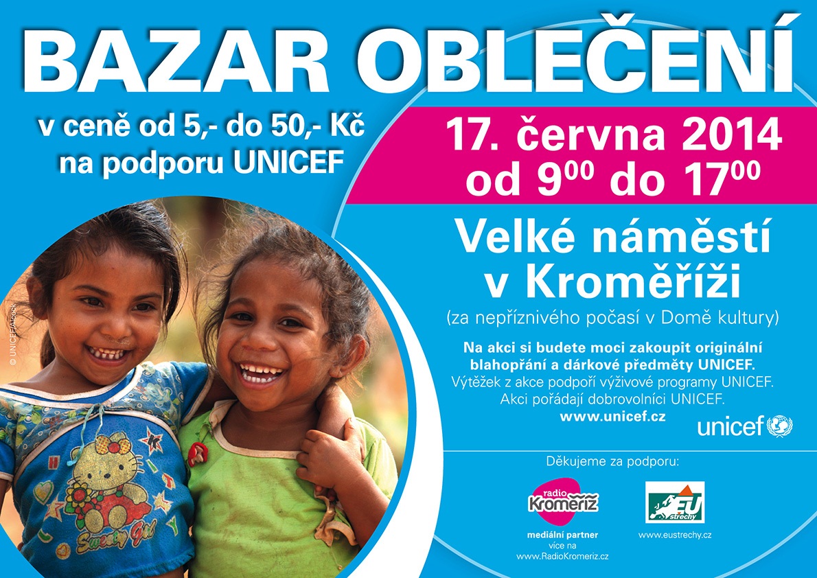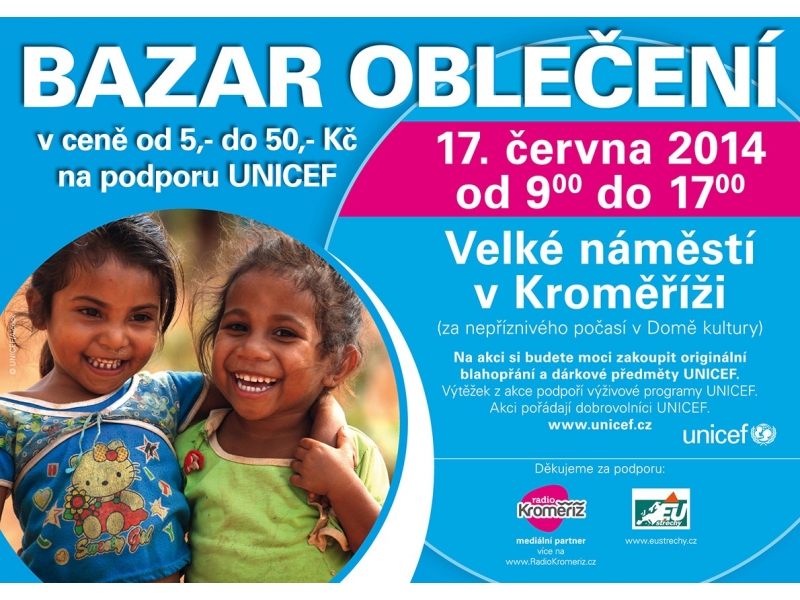 V úterý 17. června 2014 se uskuteční bazar oblečení na podporu UNICEF. Od 9:00 do 17:00 na Velkém náměstí v Kroměříži (v případě nepříznivého počasí v Domě kultury Kroměříž) bude možné zakoupit oblečení v ceně od 5 do 50 Kč. Celý vybraný výtěžek z bazaru poputuje na výživové programy UNICEF.
