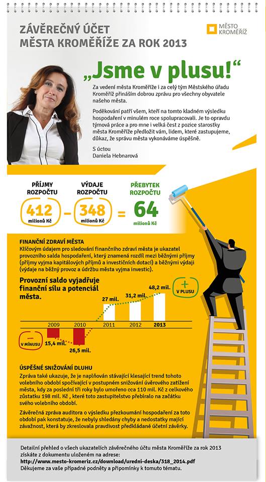 „Od mého nástupu do funkce starostky byl hospodářský výsledek Kroměříže vždy přebytkový a téměř dvou set milionový dluh jsme snížili o více než polovinu. I když si myslím, že naši práci na radnici musí posoudit hlavně sami občané, ráda bych zdůraznila, že se v našem městě daří hospodařit efektivně a navíc díky mnoha opatřením i transparentně,“ komentuje závěrečný účet města starostka Daniela Hebnarová, která dodává: „Pokud se nastavený trend hospodaření udrží i v dalších letech, město Kroměříž bude již v roce 2016 v základu oddlužené. A desítky milionů, které nyní poukazujeme na splátky, se mohou využít na další investice do infrastruktury, školství, sociální oblasti či podpory zaměstnanosti. Jsem velice ráda, že jsem k tomu mohla osobně přispět.“