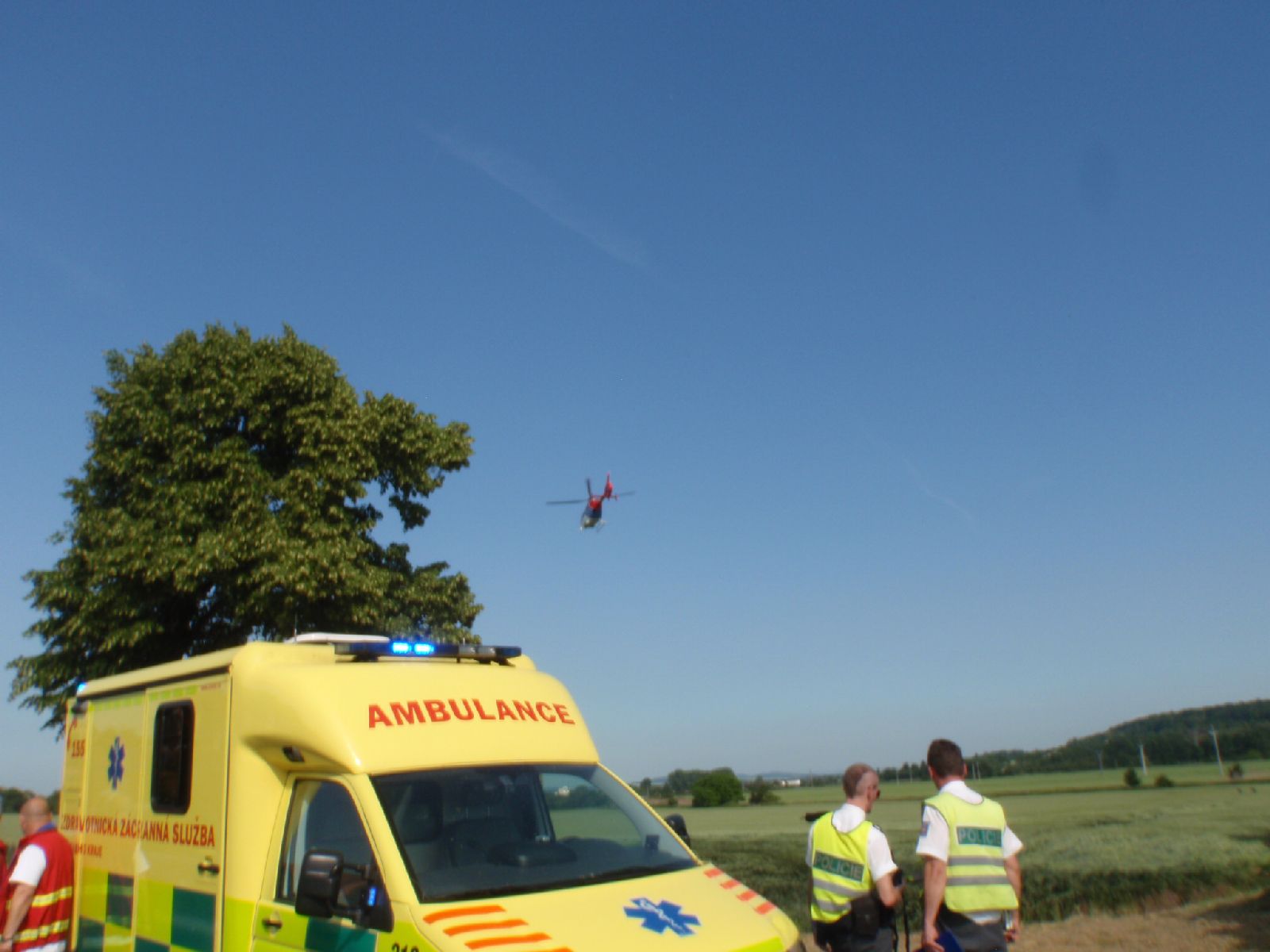 Hasiči okamžitě pomohli záchranářům s transportem vážně zraněného motorkáře do sanitky a současně připravili prostor pro přistání vrtulníku letecké záchranné služby. Ten musel přistát na sousedním pozemku pole, protože vzduch nad asfaltem komunikace byl tak rozpálený a řídký, že by mohl být zkomplikován následný start.