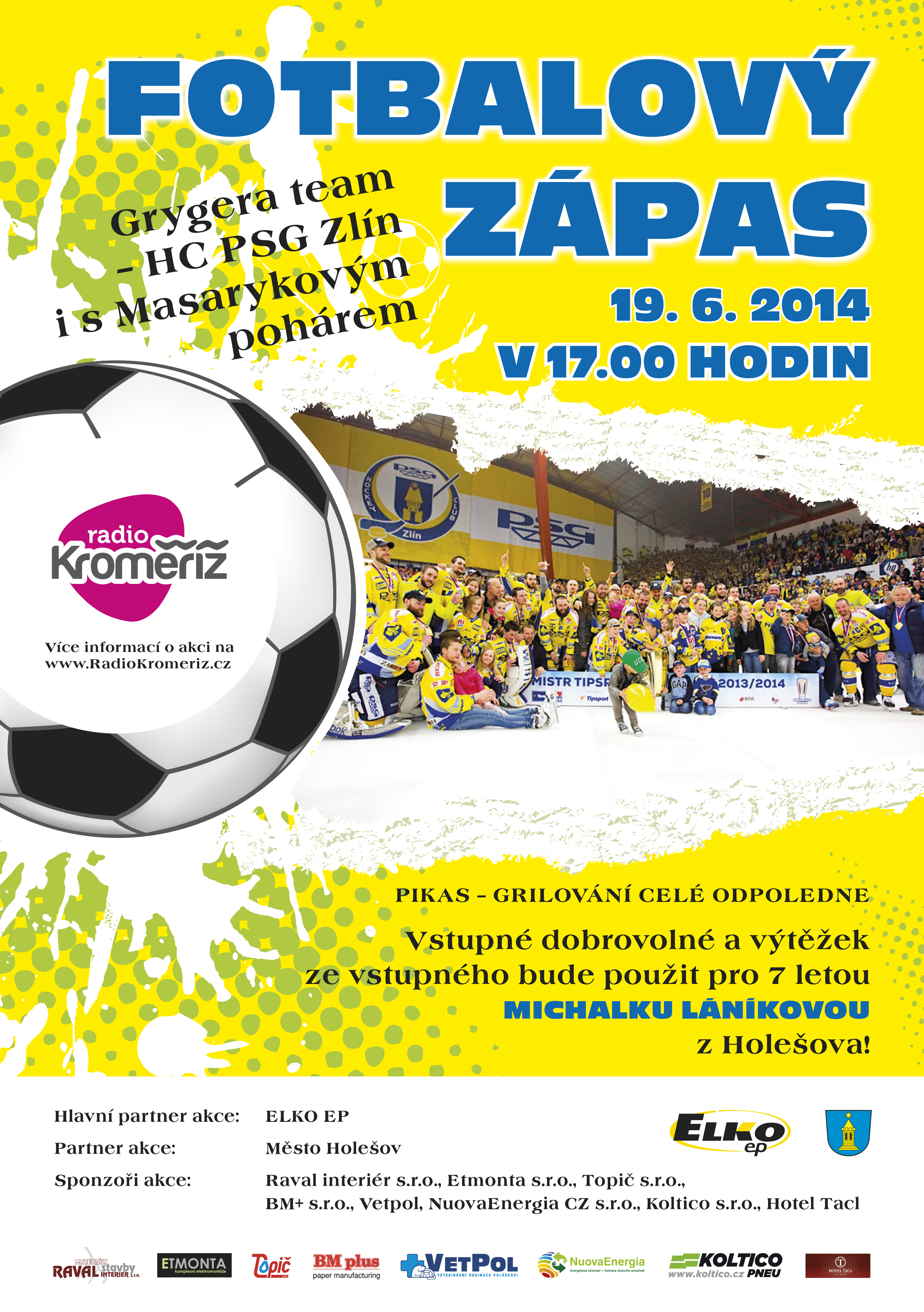 Ve čtvrtek 19. června 2014 od 17 hodin sehrají bývalý fotbalisté Holešova pod taktovkou Zdeňka Grygery benefiční zápas proti mistrům České republiky v hokeji mužstvu HC PSG Zlín, kteří na stadion ve Všetulích přijedou i s vítězným Masarykovým pohárem.