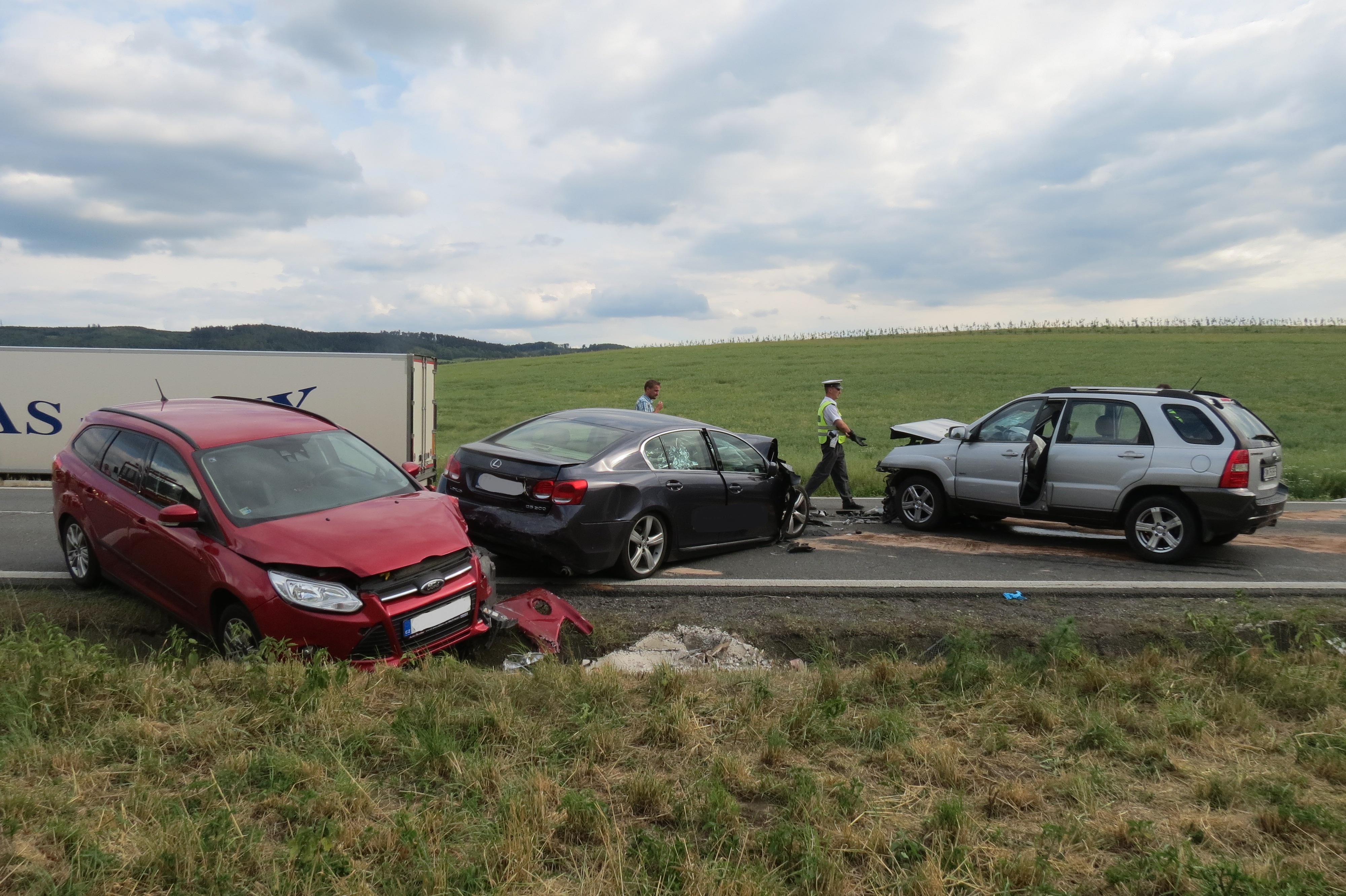 "Šedesátiletý řidič osobního automobilu Kia Sportage jel ve směru od obce Kožušice na Uherské Hradiště. Z doposud nezjištěných příčin přejel na rovném úseku do protisměru a tam se čelně střetl s právě projíždějícím vozidlem Toyota Lexus jedoucím ve směru na Kožušice. Při nárazu byla toyota odhozena dozadu a za ní jedoucí vůz Ford Focus již nestihl na tuto situaci zareagovat a do toyoty narazil. Nehoda si vyžádala čtyři zraněné osoby a jedno smrtelné zranění. Zemřela šedesátiletá spolujezdkyně na předním sedadle kie. Řidič tohoto vozu i jeho druhý sedmadvacetiletý spolujezdec byl zraněn těžce. Záchranáři oba muže sanitními vozy převezli do brněnské nemocnice. Šedesátiletý řidič toyoty vyvázl bez úhony, jeho šestapadesátiletá spolujezdkyně však utrpěla těžké zranění. Letecky byla transportována do nemocnice v Brně. Z tříčlenné osádky fordu byla lehce zraněna pětatřicetiletá spolujezdkyně, stejně starý řidič a čtyřletý chlapec zraněni nebyli. Hoch byl i přesto převezen do nemocnice na pozorování. Provoz na silnici byl po dobu vyšetřování nehody zastaven," popsala nehodu policejní mluvčí Simona Kyšnerová.