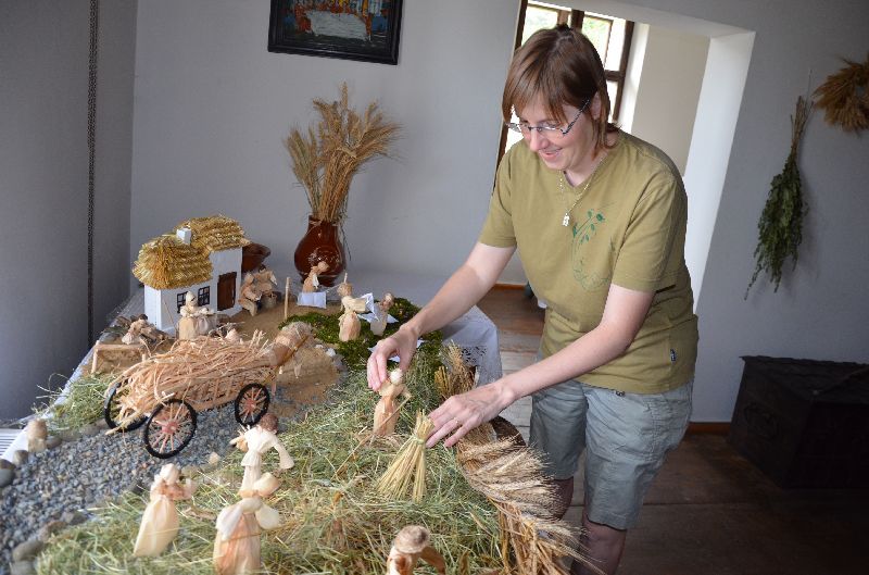 Protože je léto ve znamení žní a sklizně úrody, připravila slečna Leona Čapková, která má rukodělnou lidovou tvorbu jako svůj koníček, pro návštěvníky velký výjev z kukuřičného šustí.