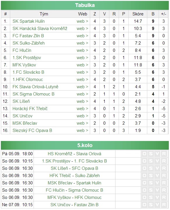 Po třech odehraných kolech MSFL přišel na řadu zápas suverénně prvního Hulína s třetí Kroměříží. Kompletní kádry, postavení v tabulce, pěkné počasí, výborně připravený trávník, to vše nabízelo divákům sobotní fotbalové odpoledne. Diváků se nakonec sešel slušný počet a hráči měli možnost se předvést. Derby vyznělo lépe pro hosty z Kroměříže, kteří domácímu Spartaku uštědřili první porážku v sezóně 3:1. Hulín si i přes porážku udržel vedení v tabulce, Hanácká Slavia se posunula na druhé místo.