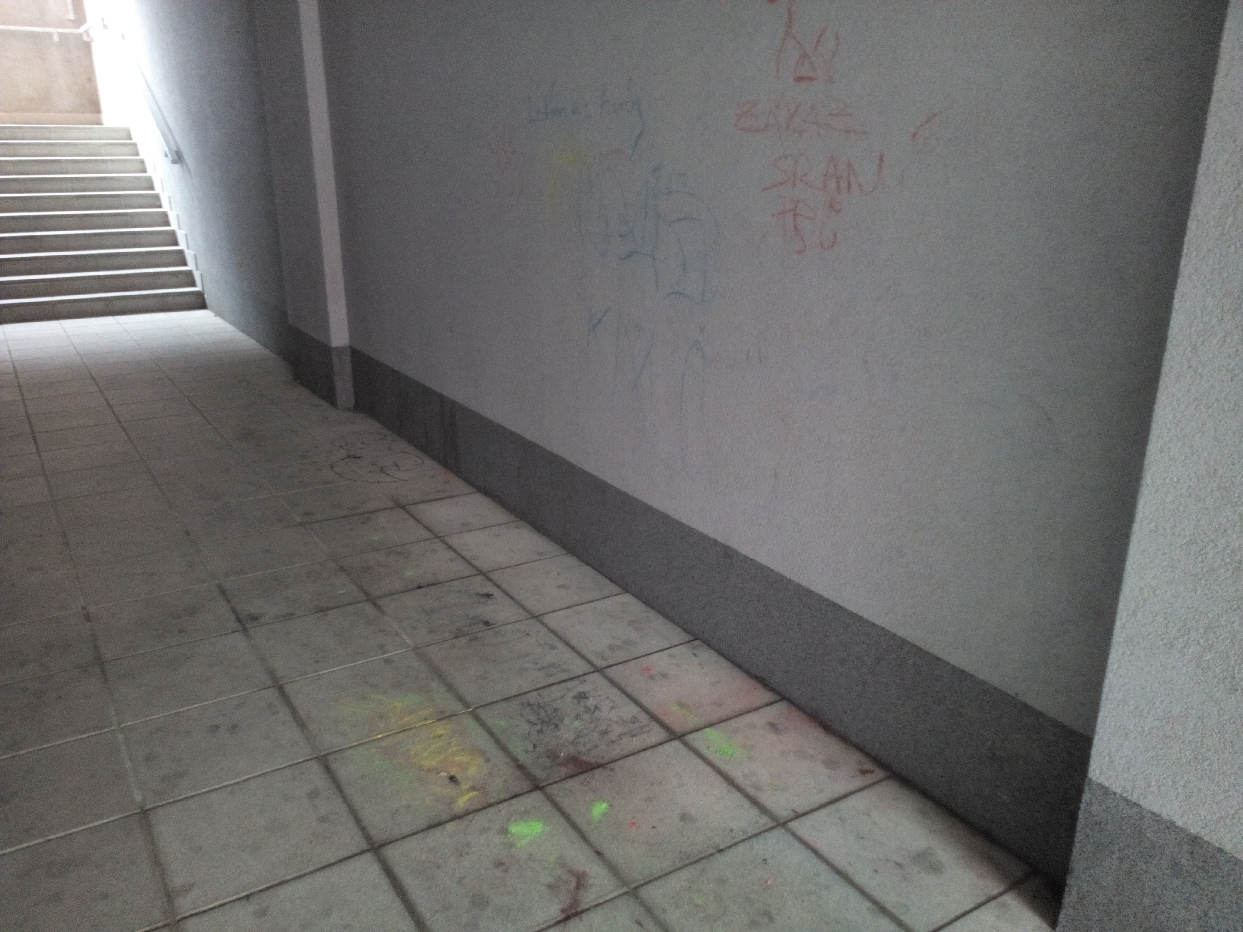 Strážníci po příjezdu na místo našli skupinku tří osob, dvě ženy ve věku 21 a 37 let a třiadvacetiletého muže. Hluk strážníci po příjezdu nezaznamenali, ale na místě, kde se skupinka nacházela, byly nové nápisy na zdi i dlažbě (viz fotogalerie).