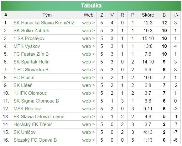 Naopak Hanácká Slavia Kroměříž v předehrávaném pátečním utkání s Orlovou-Lutyni nedala hostům šanci skórovat a po vítězství 2:0 se vyšvihla do čela tabulky.