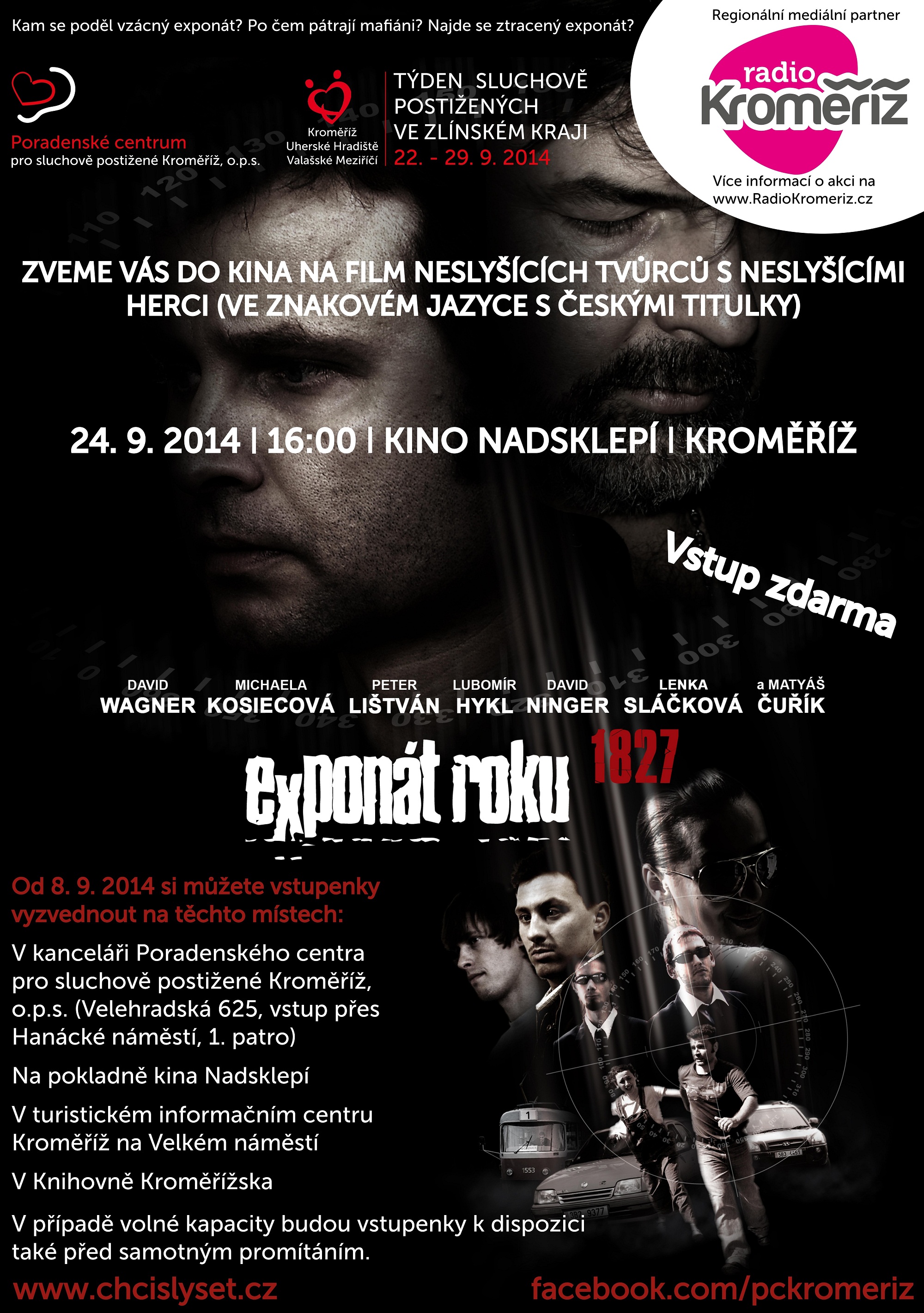 V rámci této aktivity bude ve středu 24. září od 16 hod. v kině Nadsklepí promítán film neslyšících tvůrců s neslyšícími herci nazvaný tajemně Exponát roku 1827, který získal titul "Nejlepší film pro sluchově postižené roku 2009".