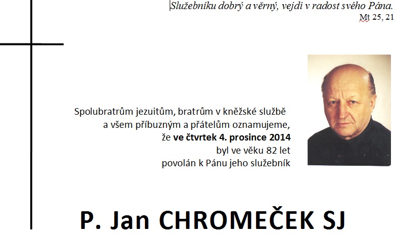 Ve věku 82 let zemřel ve čtvrtek 4. prosince 2014 v kroměřížské nemocnici P. Jan Chromeček, SJ, dlouholetý duchovní správce Svatého Hostýna. Rozloučení se zesnulým se uskuteční v pátek 12. prosince od 14.00 hodin v bazilice Nanebevzetí Panny Marie na Svatém Hostýně a poté bude jeho tělo uloženo na místním hřbitově.
