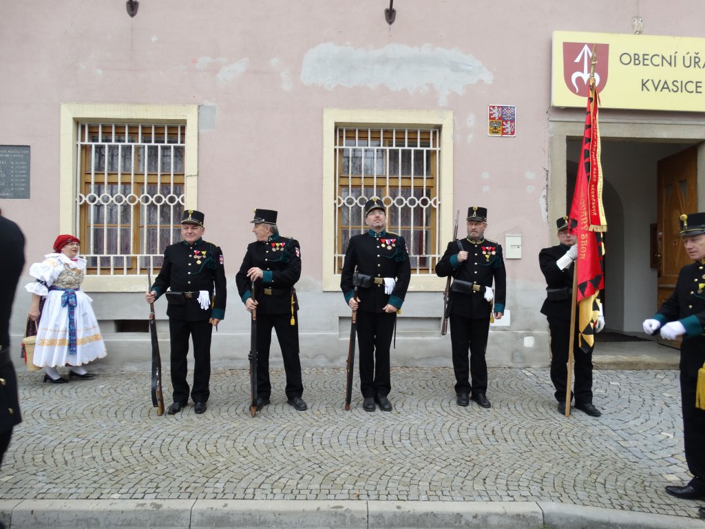 Po odhalení pamětní desky paní Evou, která ji nechala zhotovit v Německu, vypálili čestnou salvu. Nebyli to jen oni, kteří zpestřili slavnostní akci. V krásných hanáckých krojích vyčnívaly i paní Marie Rybová, paní Fialová z Tlumačova a Janička Koželová. Nemohu opomenout poděkování svému spolehlivému synovci Vítu Koutňákovi za včasný dovoz pamětní desky z Německa do Kvasic.