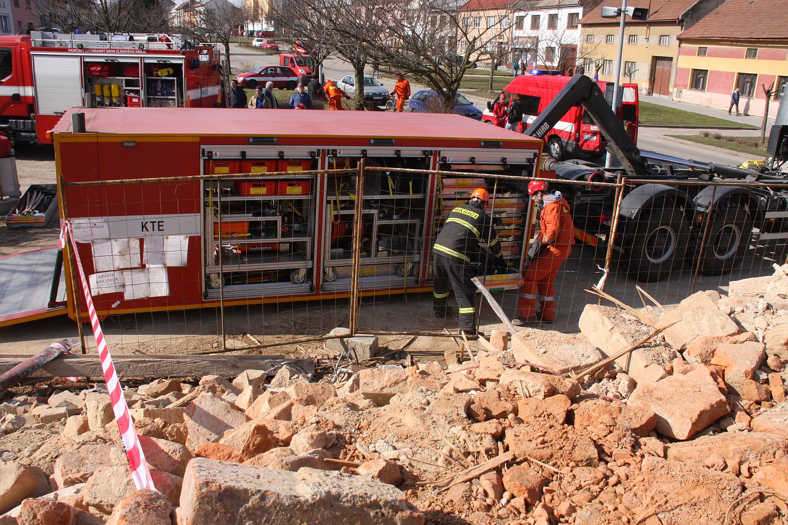 Už před devátou hodinou ranní začali profesionální hasiči postupně „obsazovat“ prostor demolice objektu bývalého obecního úřadu v centru Morkovic – Slížan. Jako první byli na místě připravovaného prověřovacího cvičení jeho řídící a organizátoři. Ti spolu s pracovníky společnosti provádějící demolici rozmístili v sutinách tři osoby (zaměstnance obecního úřadu) a tři figuríny imitující zasypané osoby. S přípravou jednotlivých prostor pomohlo i pásové rypadlo provádějící demolici stavby.
