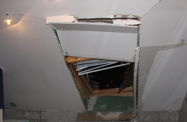 V Otrokovicích, místní část Kvítkovice, střechu poškodily dva vysoké zděné komíny. Jeden z nich se okamžitě zřítil k zemi, druhý však zůstal zablokovaný na sedlové střeše. Torzo komína se podařilo hasičům odstranit za pomoci automobilové plošiny. Z ní příslušník lezecké skupiny hasičů částečně rozebíral torzo komína. Kolem zbytku uvázal smyčku a za pomocí ruční kladky byla zbylá část komína stržena ze střechy. Práce hasičů byla velice profesionální, takže při stržení nedošlo k poškození střešní krytiny na níž komín ležel. Střecha byla následně provizorně zabezpečena plachtami, které obstarali hasiči města Otrokovice.